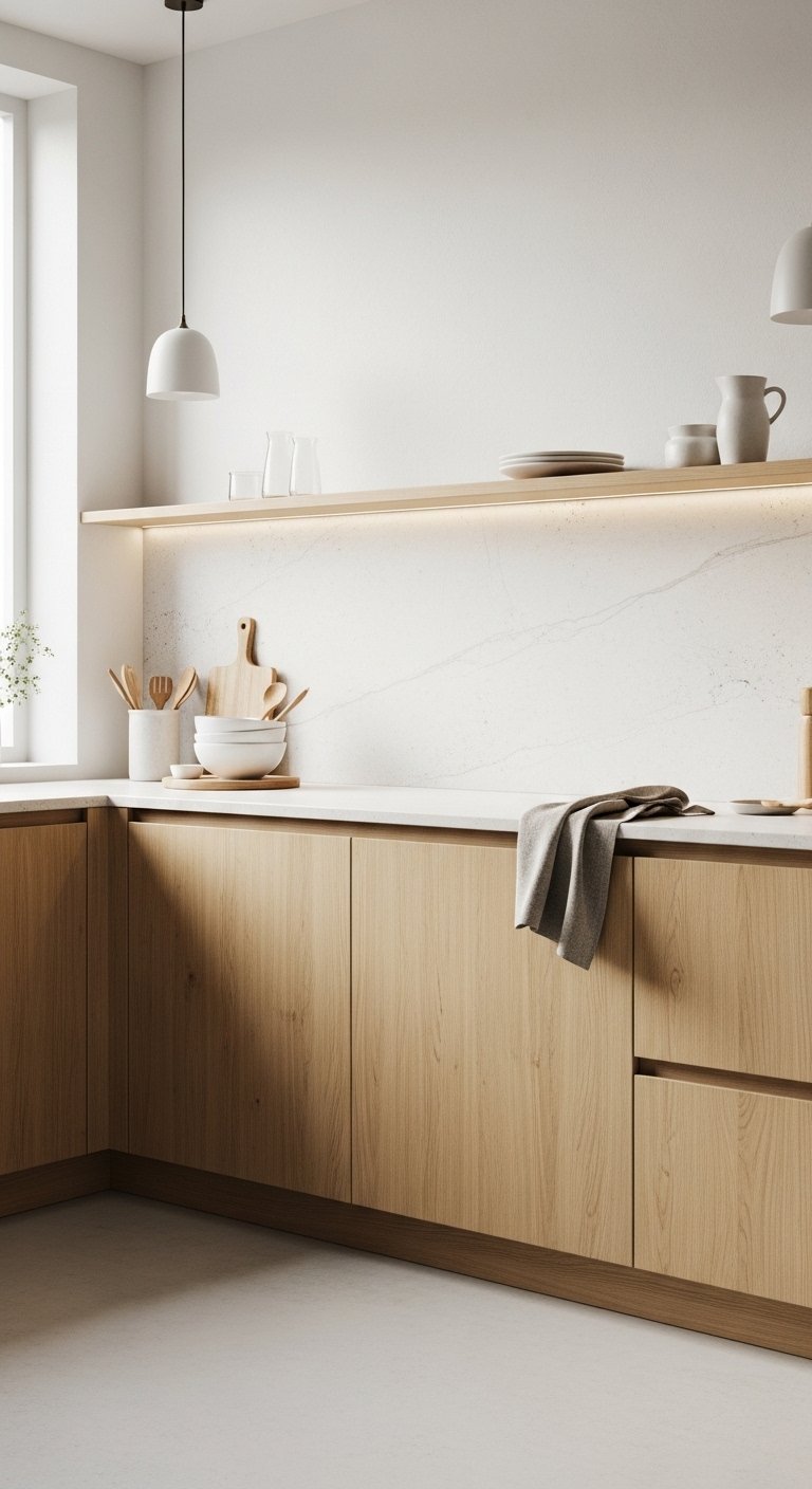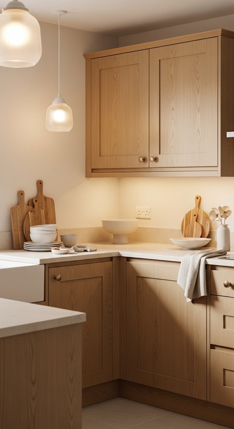 1. Light Oak Cabinets with Soft White Plaster Walls for a Calm Glow