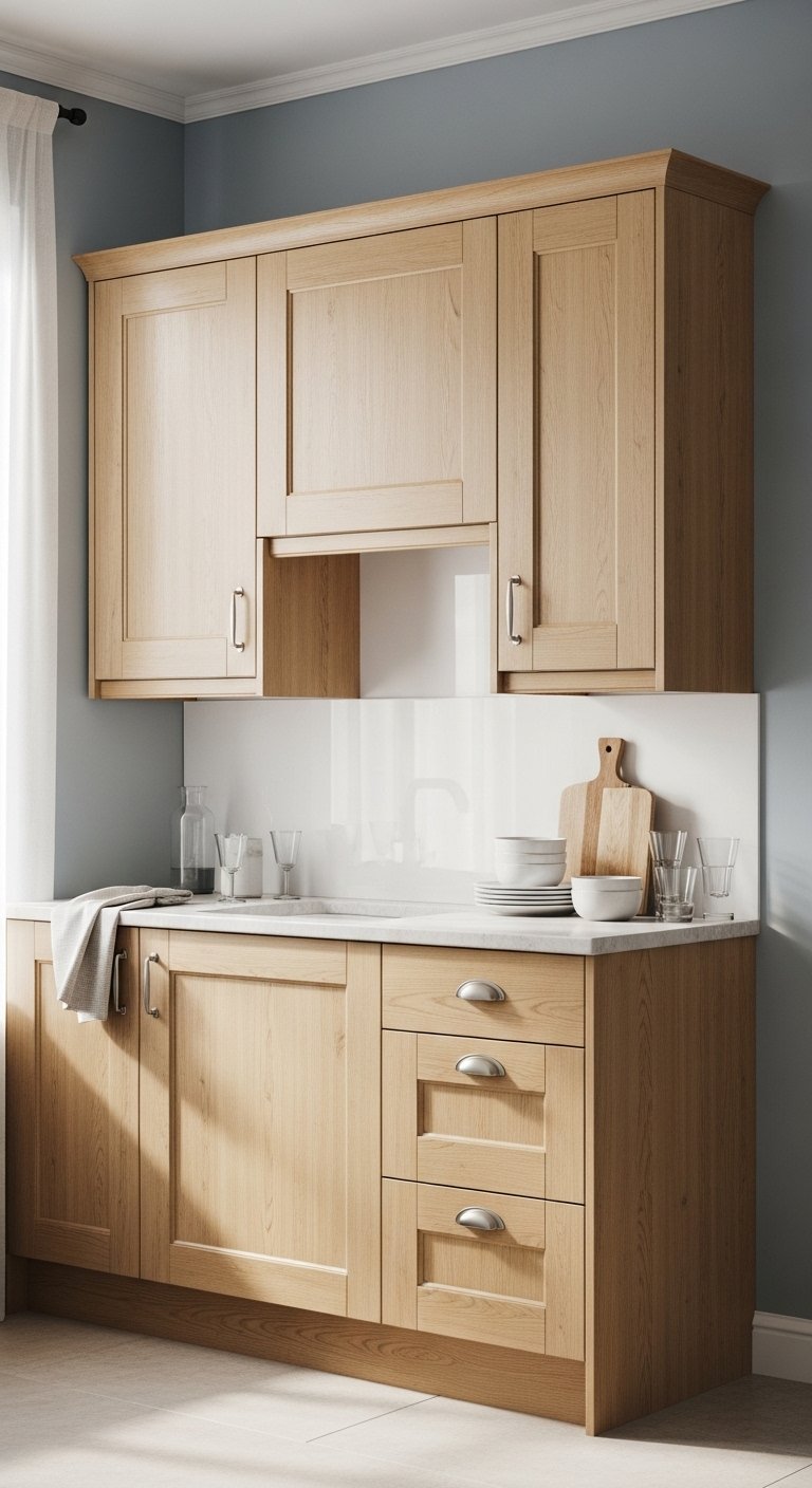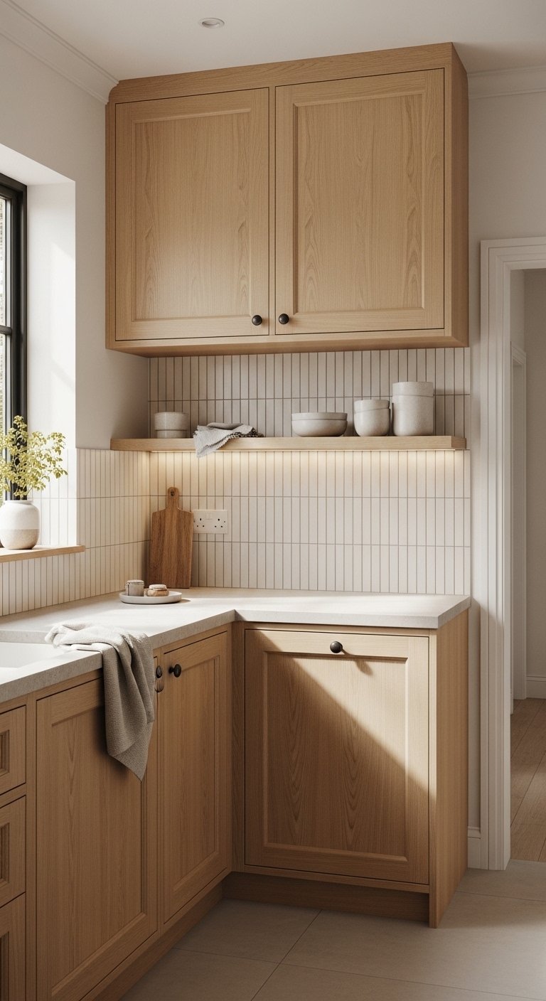 Vertical tile behind light oak cabinets makes the kitchen feel taller and brighter. Choose slim tiles in warm white or light sand color. The vertical layout draws the eye upward and increases the sense of space. This is especially helpful in compact kitchens.Use matte finish tiles to keep the look calm. Glossy tiles can reflect too much light and feel busy. Pair this backsplash with simple white countertops to maintain brightness. Add wooden floating shelves to repeat the oak tone subtly.Install slim under cabinet lighting to highlight the vertical pattern. The light creates gentle shadows that add depth. Use minimal decor such as ceramic bowls or glass jars. This keeps the focus on texture rather than clutter.This idea feels modern but warm. The vertical movement combined with light oak grain creates visual interest without heavy contrast.