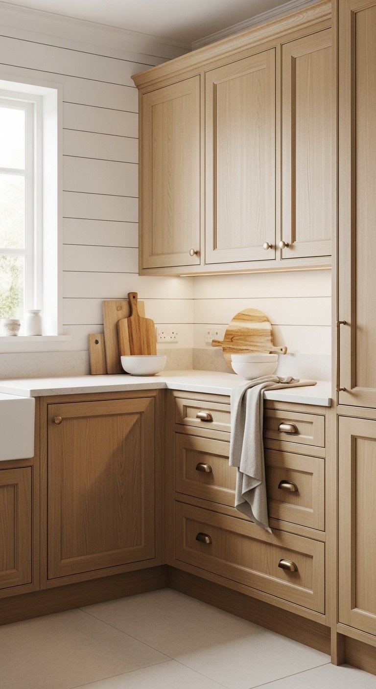 16. Light Oak Cabinets with Soft White Shiplap for Subtle Texture