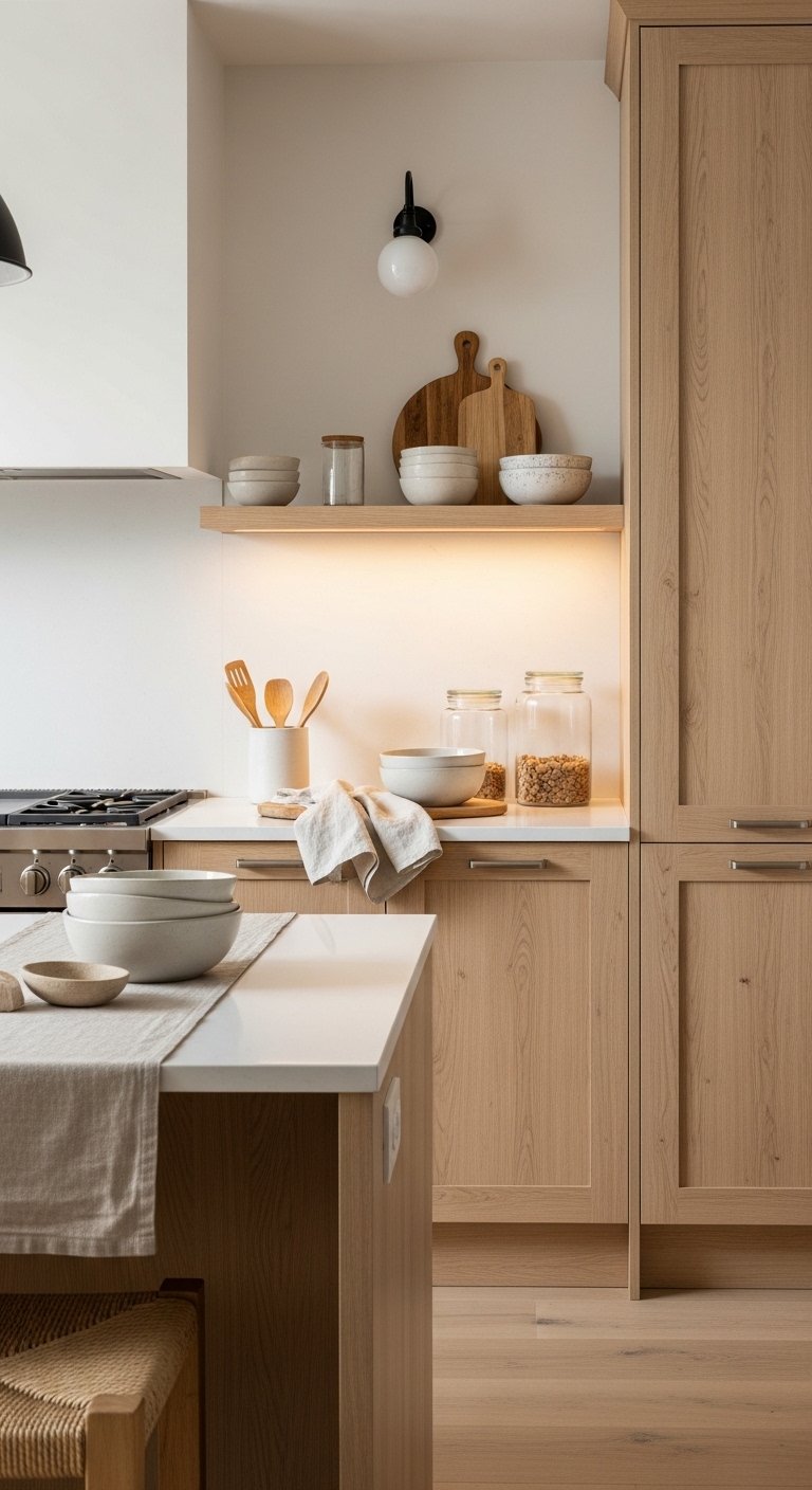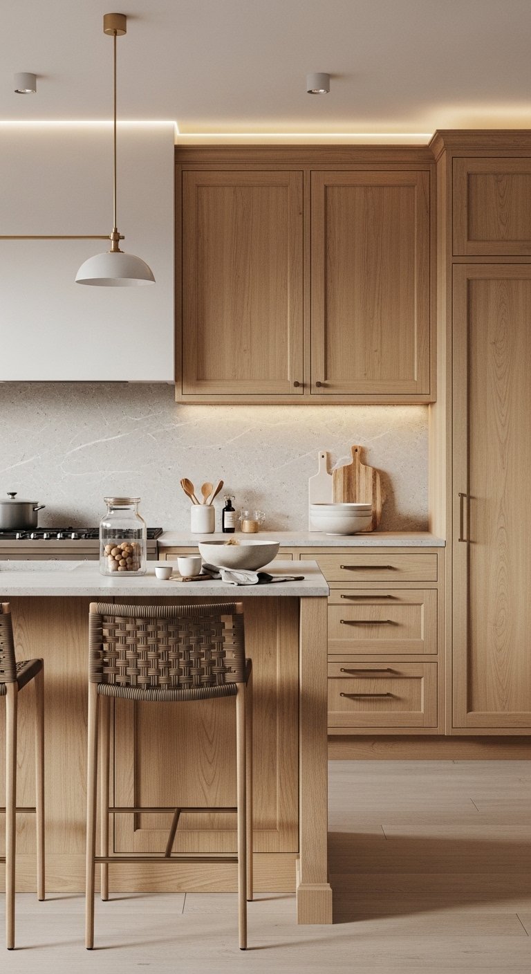 20. Light Oak Cabinets with Layered Neutral Textures for Depth