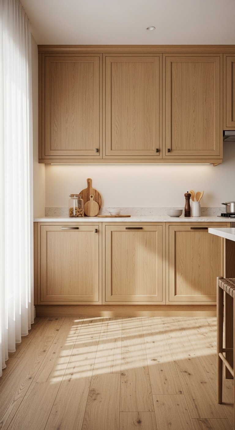 Pair light oak kitchen cabinets with light wood flooring in a similar tone to create seamless brightness. This matching palette removes harsh transitions and helps the kitchen feel larger. Choose flooring with subtle grain so it complements the cabinets without competing.Add a soft white backsplash to break the wood gently. This prevents the space from feeling overly warm. Use a light quartz countertop to maintain brightness. Introduce woven stools or neutral textiles for layered texture.Keep hardware minimal so the wood tones remain the focus. Warm under cabinet lighting enhances the natural variation in the grain. Natural daylight will flow smoothly across the floor and cabinets. This idea creates a continuous and airy kitchen that feels calm, balanced, and visually spacious.