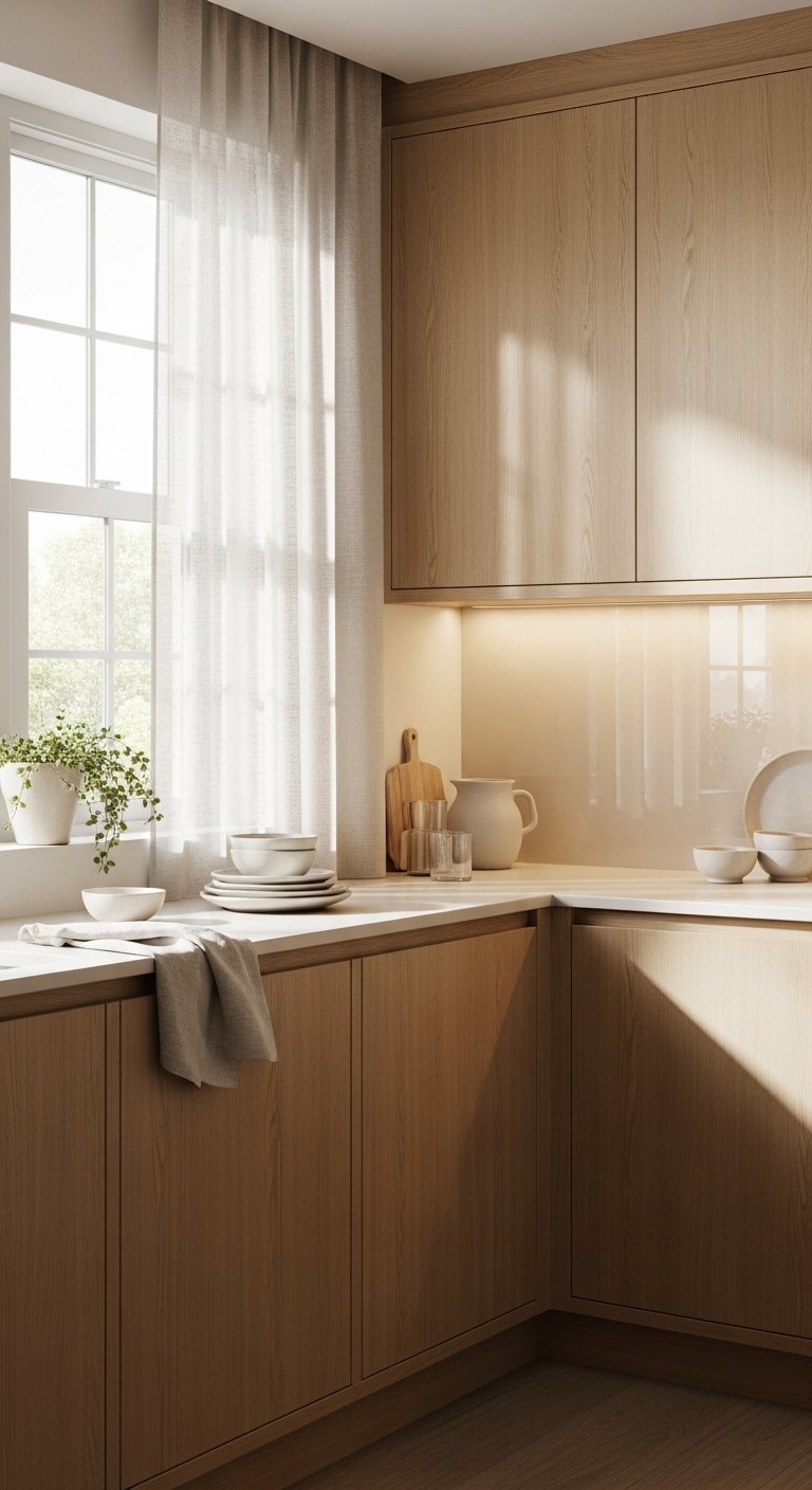 Use sheer window styling to enhance light oak kitchen cabinets and maximize brightness. Choose soft linen curtains in warm white or pale cream. These fabrics filter sunlight gently while keeping privacy. The diffused light highlights the oak grain beautifully.Keep the window area uncluttered. Use a slim sill with small glass jars or a single plant. This keeps the focus on light rather than decor. Pair with a light backsplash to reflect sunlight deeper into the kitchen. Add warm metal hardware for subtle shine.Install reflective surfaces like a light stone countertop. This helps bounce daylight around the room. This idea works well for kitchens with one main window. The filtered light softens shadows and creates a calm, bright atmosphere centered around natural warmth.