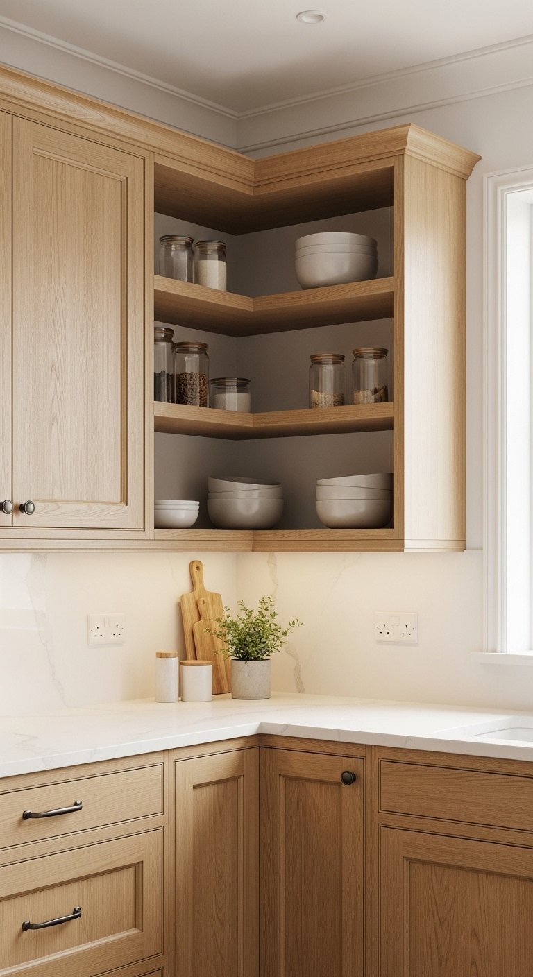 Open corner shelves soften light oak cabinets and improve light flow. Removing bulky corner cabinets prevents shadows. Use floating shelves in matching oak to keep the look cohesive.Display light colored bowls and glass containers. These reflect light and keep the shelves bright. Pair with a warm white backsplash to maintain openness. Add small plants for fresh color.Use under shelf lighting to highlight the corner. This eliminates dark areas and adds depth. Keep countertops clear to enhance the airy layout.This idea works well for compact kitchens. The open corner creates breathing room and makes the space feel larger.