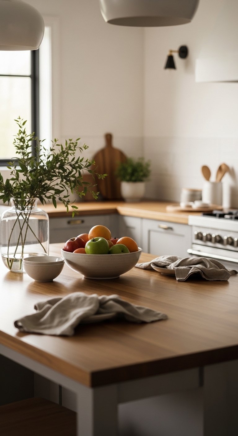 Integrating natural wood, whether in a floating shelf, countertop edge, or exposed beam, adds warmth and tactile contrast. Light oak or maple accents juxtaposed against white or muted tones create a balanced, airy feel. This combination highlights textures and keeps the kitchen from feeling flat or sterile. Small details, like wooden utensil holders or cutting boards displayed aesthetically, contribute to the layered visual style. The result is an open kitchen that feels both expansive and welcoming, perfect for modern Pinterest inspiration.