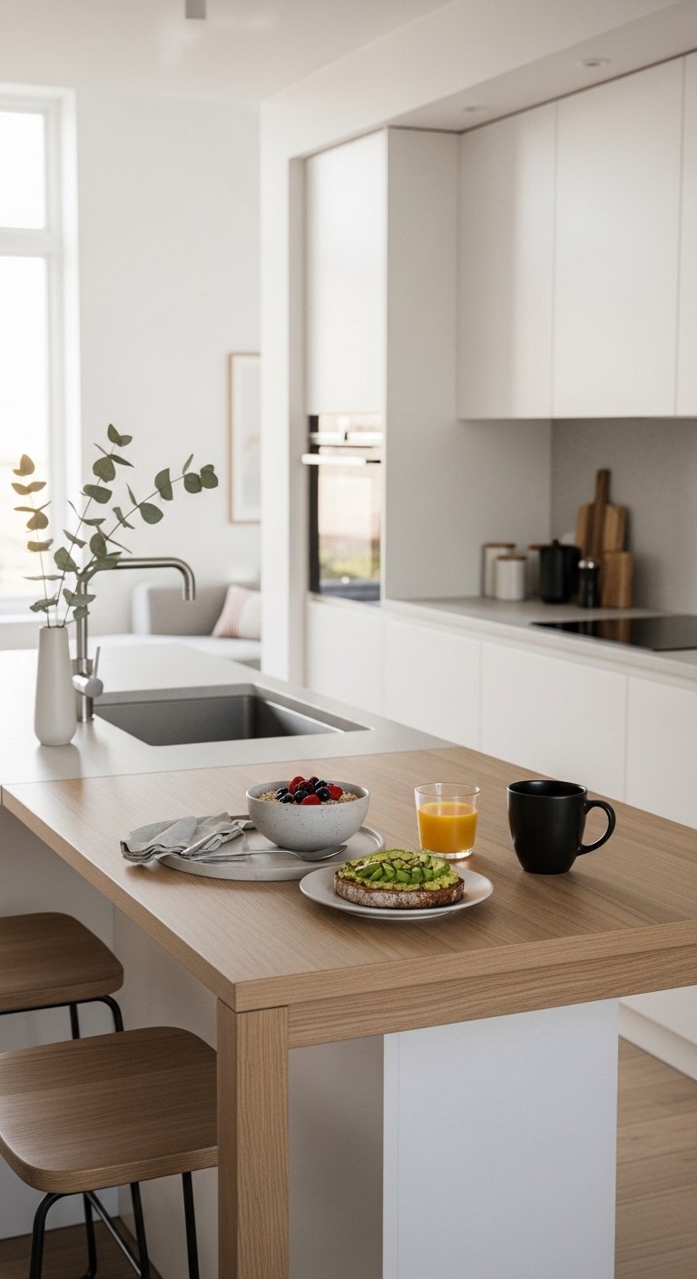 A pull-out or recessed breakfast bar maintains openness while offering casual dining space. Integrate it into an island or counter overhang, and style with sleek stools that tuck neatly underneath when not in use. Choose surfaces that complement the main countertop—marble, wood, or quartz—to keep the design cohesive. Adding pendant lighting or a small potted plant on the bar softens the space visually. This approach maximizes functionality while keeping circulation open, creating a Pinterest-inspired layout that feels practical and airy.