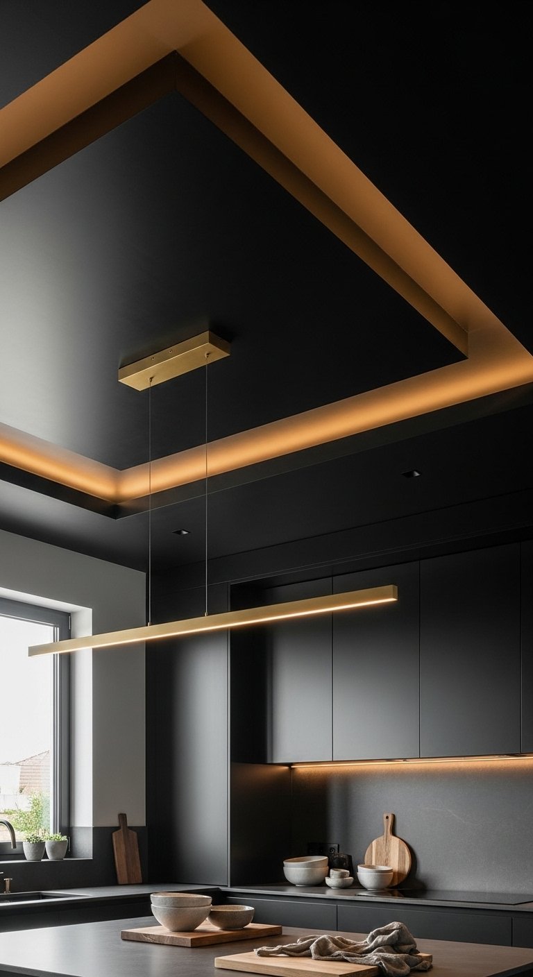 A black ceiling with gold lighting accents creates a dramatic and immersive kitchen experience. Instead of leaving the ceiling plain, this idea turns it into part of the design identity. Gold recessed lights or pendant fixtures break the dark surface and introduce warmth from above.This combination creates a restaurant-like luxury atmosphere, especially in the evening when lighting becomes the main visual element. To balance the darkness, use reflective surfaces like glossy cabinets or light countertops. This prevents the space from feeling too heavy. The result is a bold, cinematic kitchen that feels modern, stylish, and unforgettable.