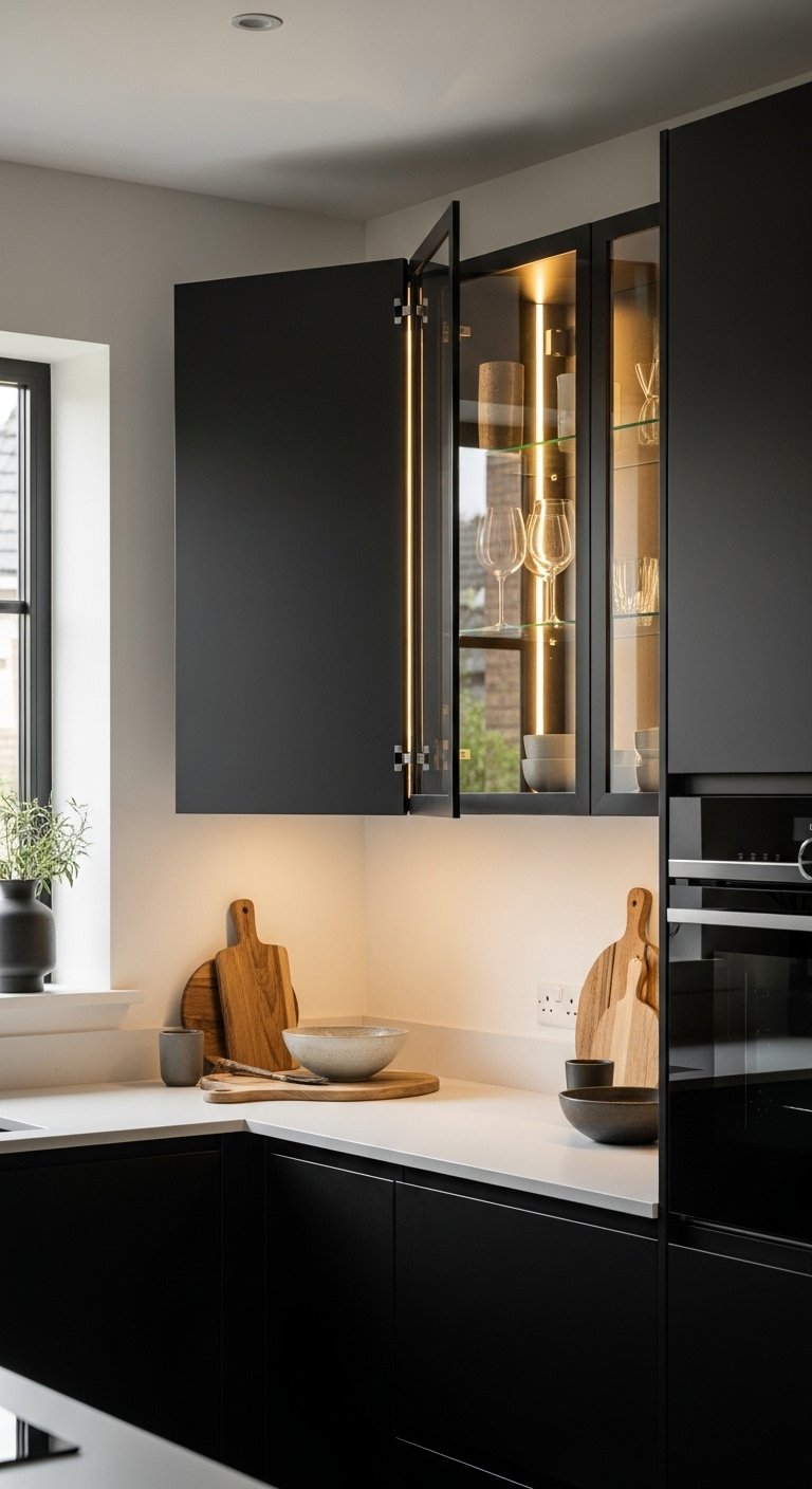 11. Black Cabinets with Gold Interior Lighting for Hidden Glow Effect