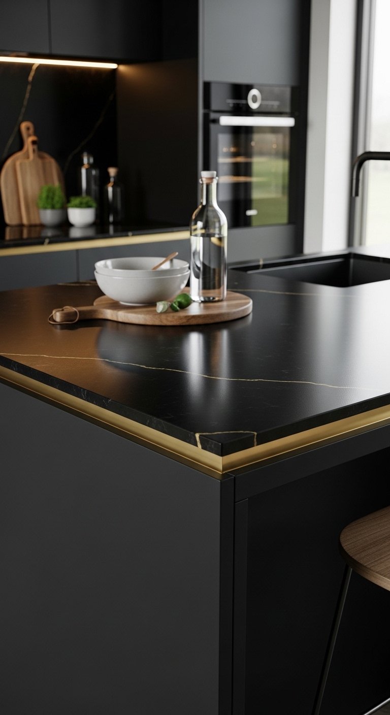 12. Black Quartz Countertops with Gold Edge Inlays for Modern Luxury Detail