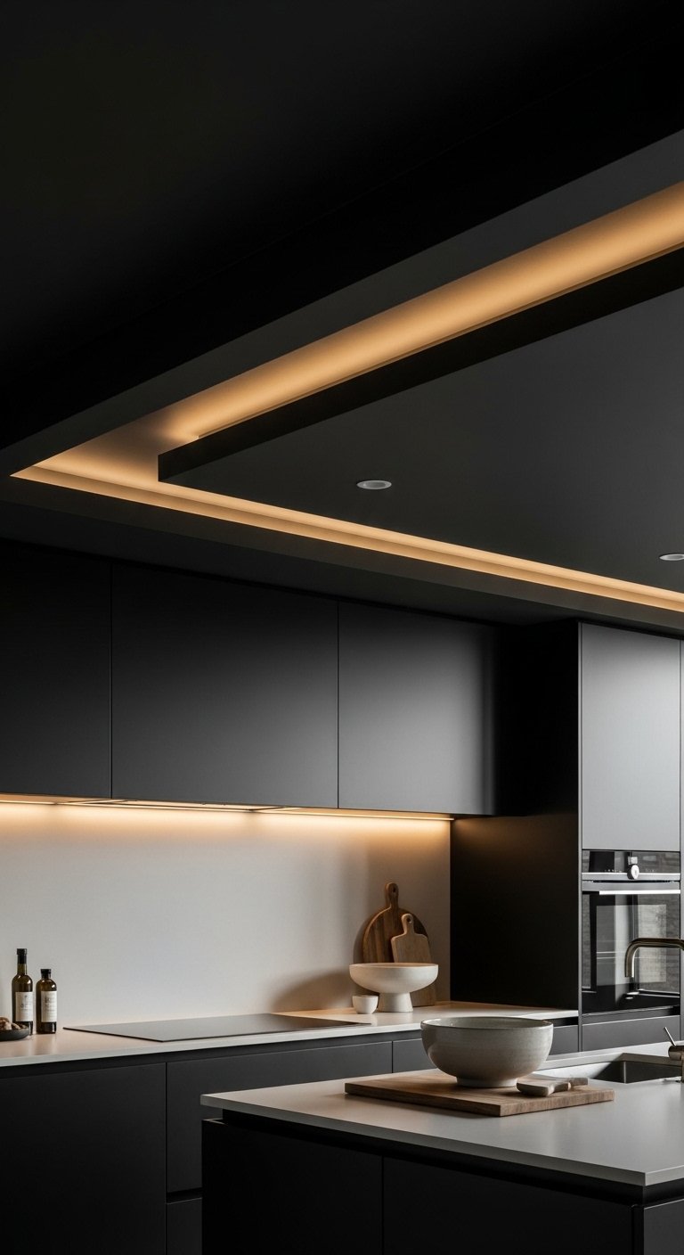 13. Black Kitchen with Gold Ceiling Strip Lighting for Floating Effect