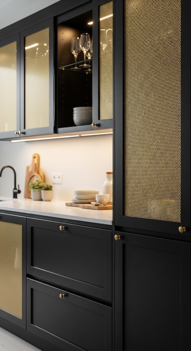 14. Black Cabinets with Gold Mesh Inserts for Textured Luxury Look