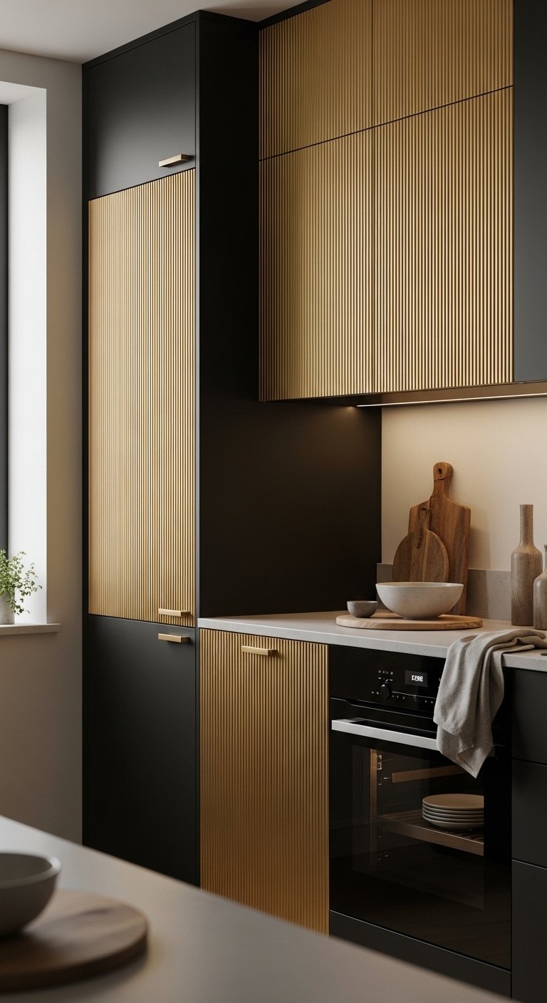 Black cabinets become far more visually interesting when you add gold ribbed texture panels in selected sections. Instead of flat surfaces, the ribbed design introduces vertical movement and depth that instantly feels custom-made. The gold finish catches light at different angles, creating soft reflections that shift throughout the day. This makes the kitchen feel alive and dynamic rather than static.This idea works especially well for tall pantry units or central cabinet sections where you want a focal point. Keep surrounding cabinets matte black so the ribbed gold texture stands out more clearly. Pair it with simple countertops and minimal handles to avoid visual overload. The contrast between smooth black surfaces and textured gold detailing creates a luxury balance that feels like a designer showroom kitchen. It is bold but controlled, making it perfect for modern Pinterest-inspired interiors.