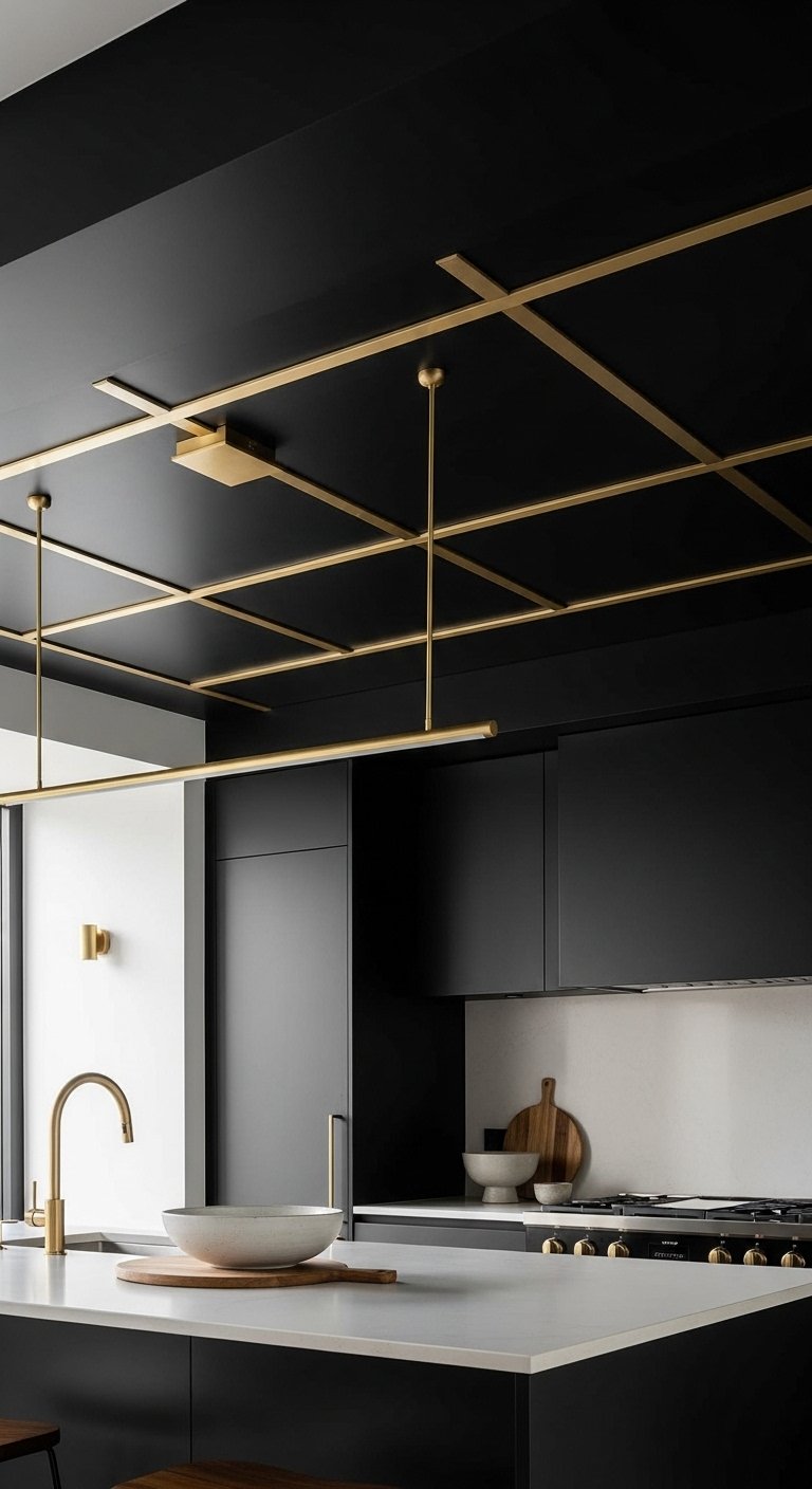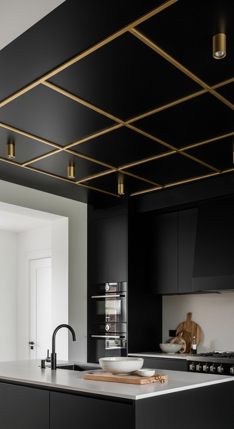 22. Black Kitchen with Gold Ceiling Grid Design for Architectural Luxury