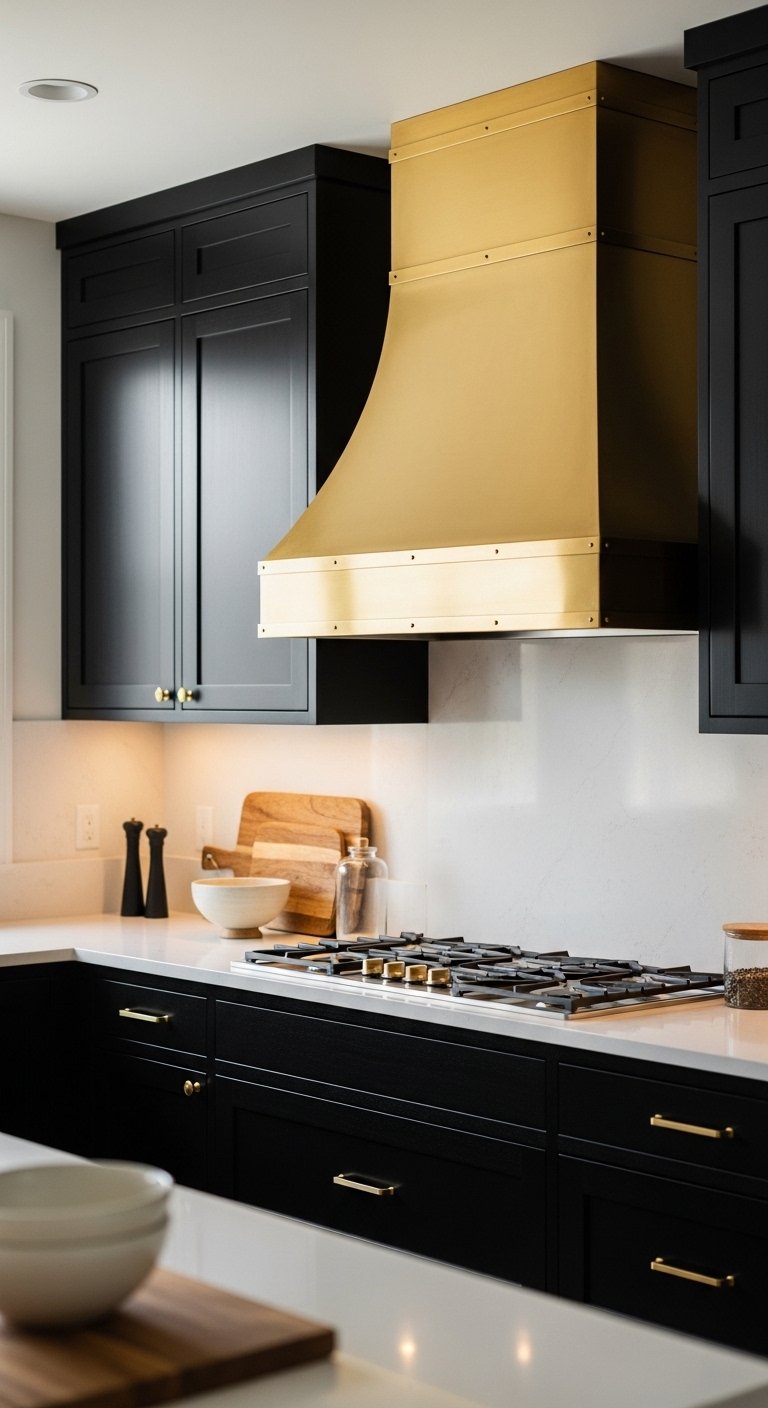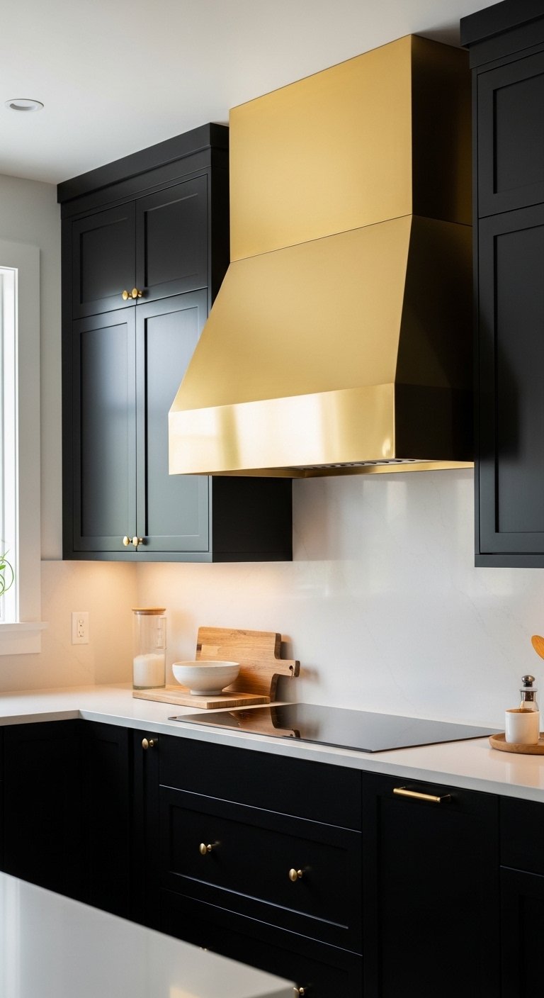 25. Black Kitchen with Gold Statement Hood Design for Bold Focal Point