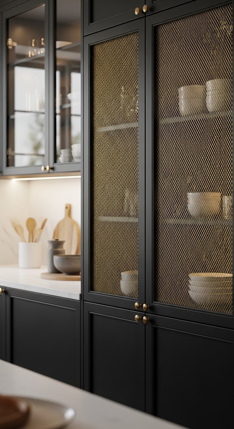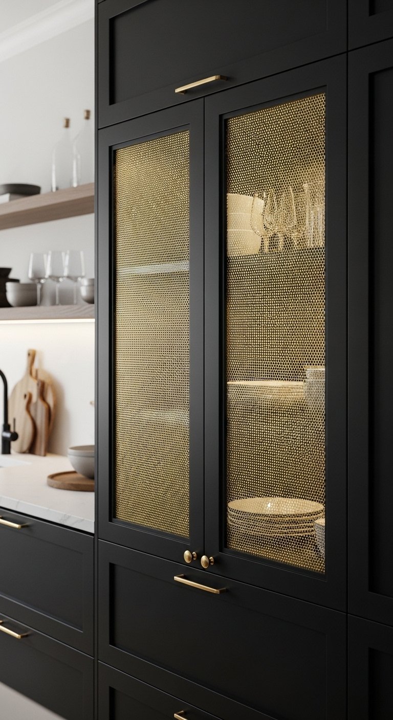 Gold mesh inserts inside black cabinet doors create a unique blend of texture and elegance. Instead of solid doors, certain sections feature fine gold mesh behind glass or open framing. This allows partial visibility of storage while still keeping a structured and refined appearance.The contrast between matte black frames and delicate gold mesh adds depth and visual interest without making the kitchen look busy. This idea works especially well for upper cabinets or display areas where you want to showcase glassware or decorative items. The mesh pattern adds a subtle industrial-luxury touch, making the kitchen feel custom-built and artistic. When paired with soft internal lighting, the gold mesh glows gently, creating a sophisticated layered effect that stands out beautifully in Pinterest kitchen inspiration boards.