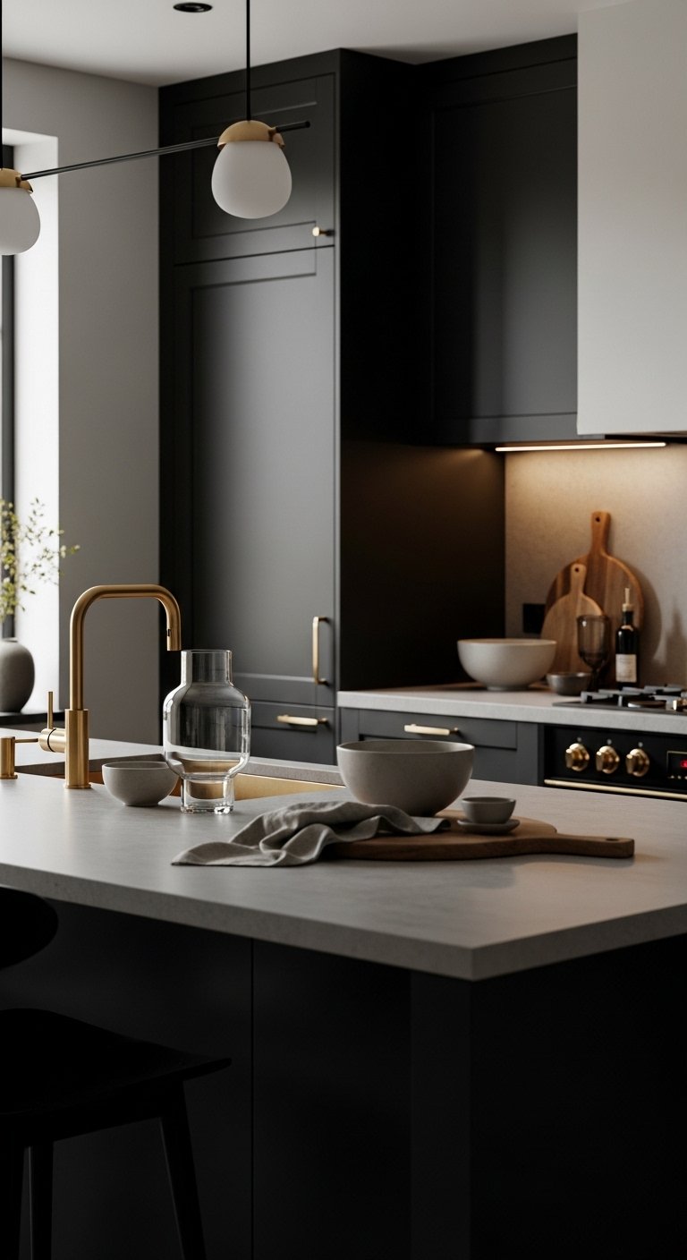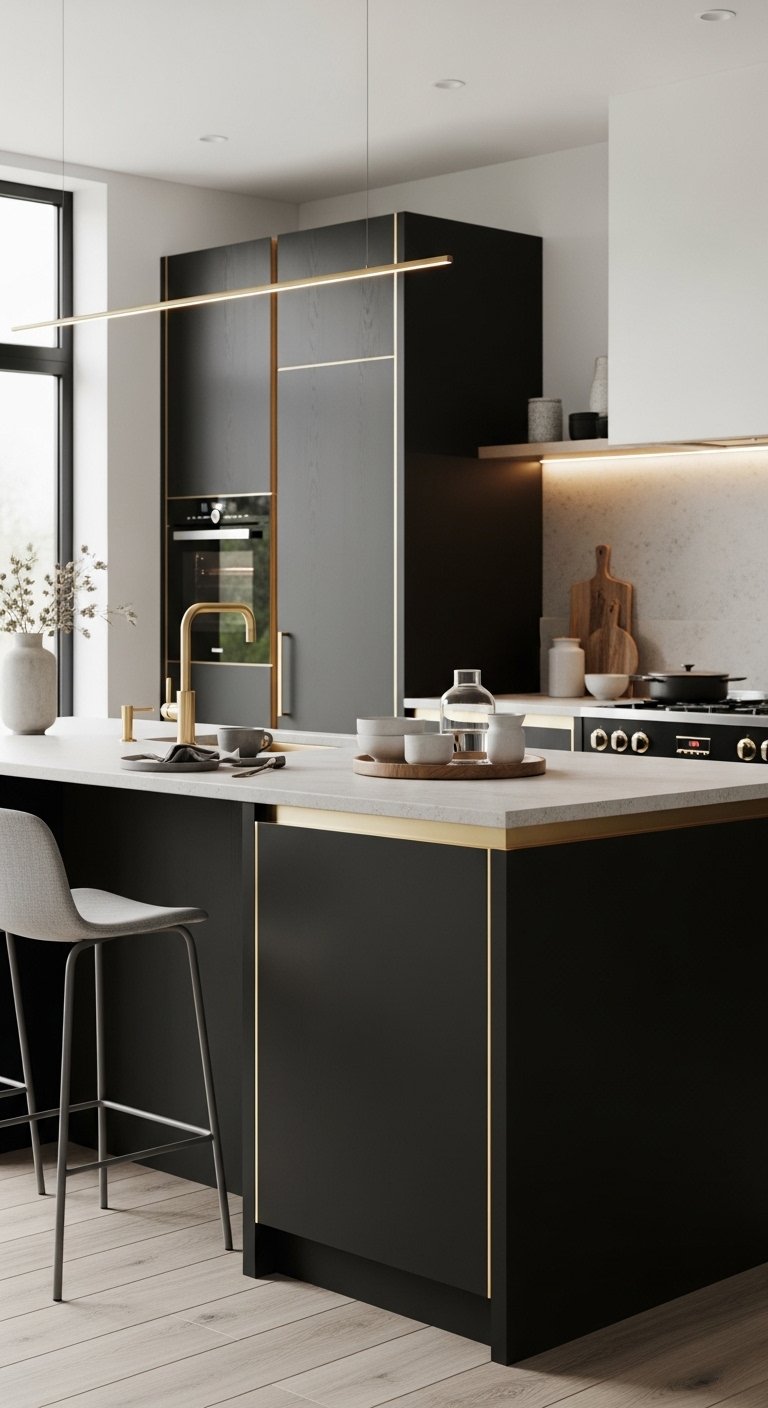 1. Matte Black Cabinets with Brushed Gold Handles for Soft Luxury Balance