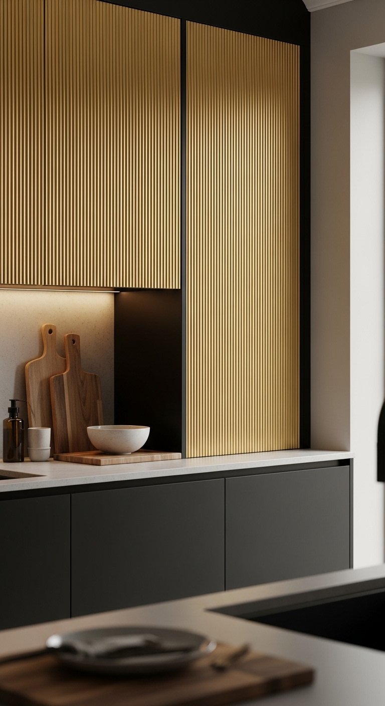 21. Black Cabinets with Gold Ribbed Texture Panels for Designer Depth