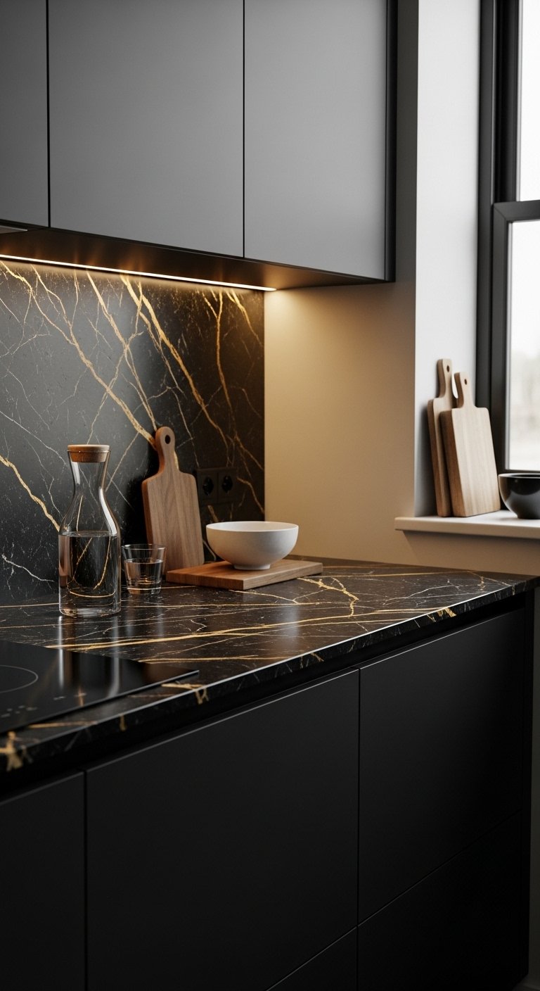 2. Black Marble Countertops with Natural Gold Veins for Rich Visual Depth