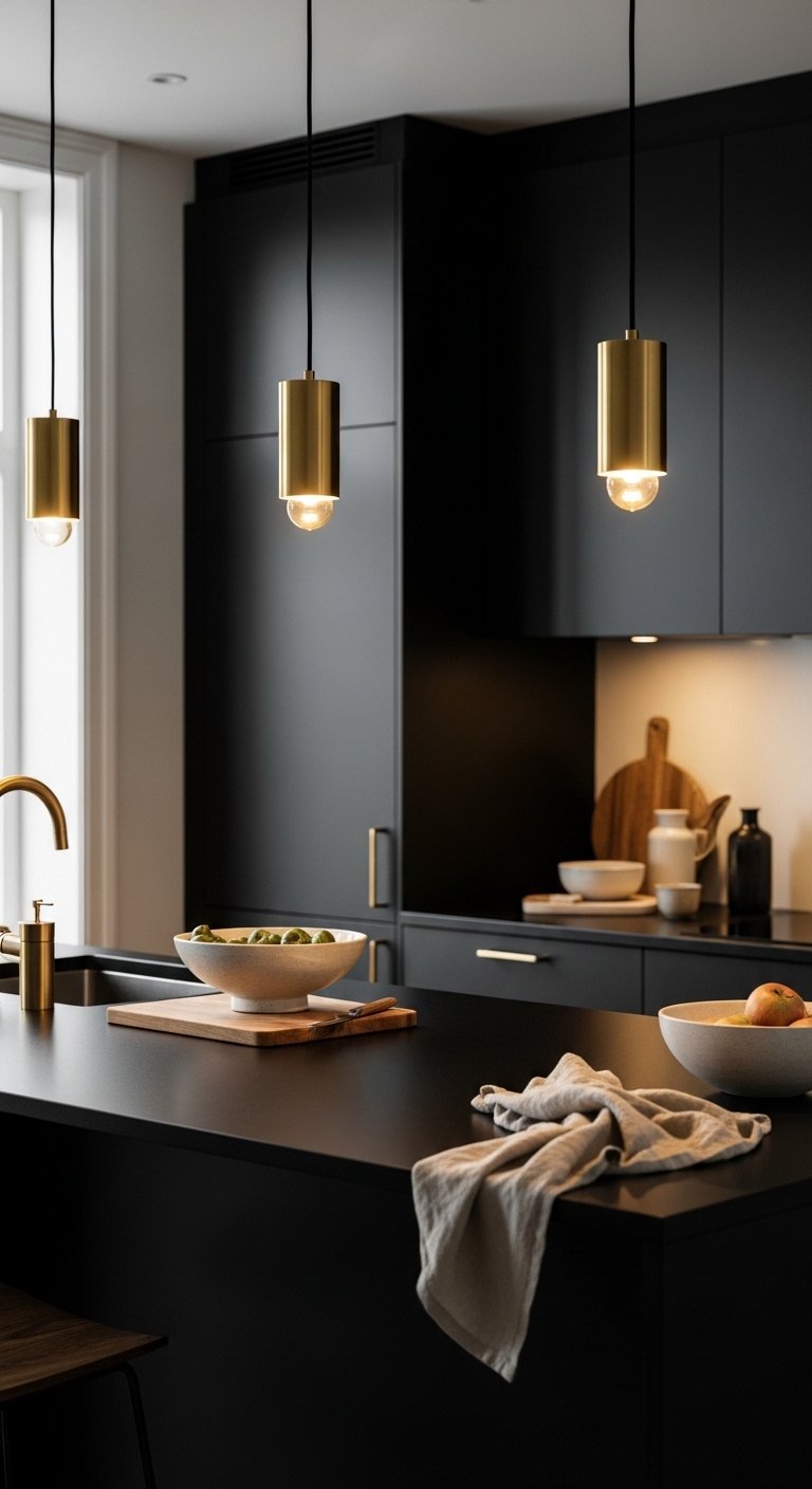 4. Gold Pendant Lighting Over Black Surfaces for Warm Luxury Atmosphere