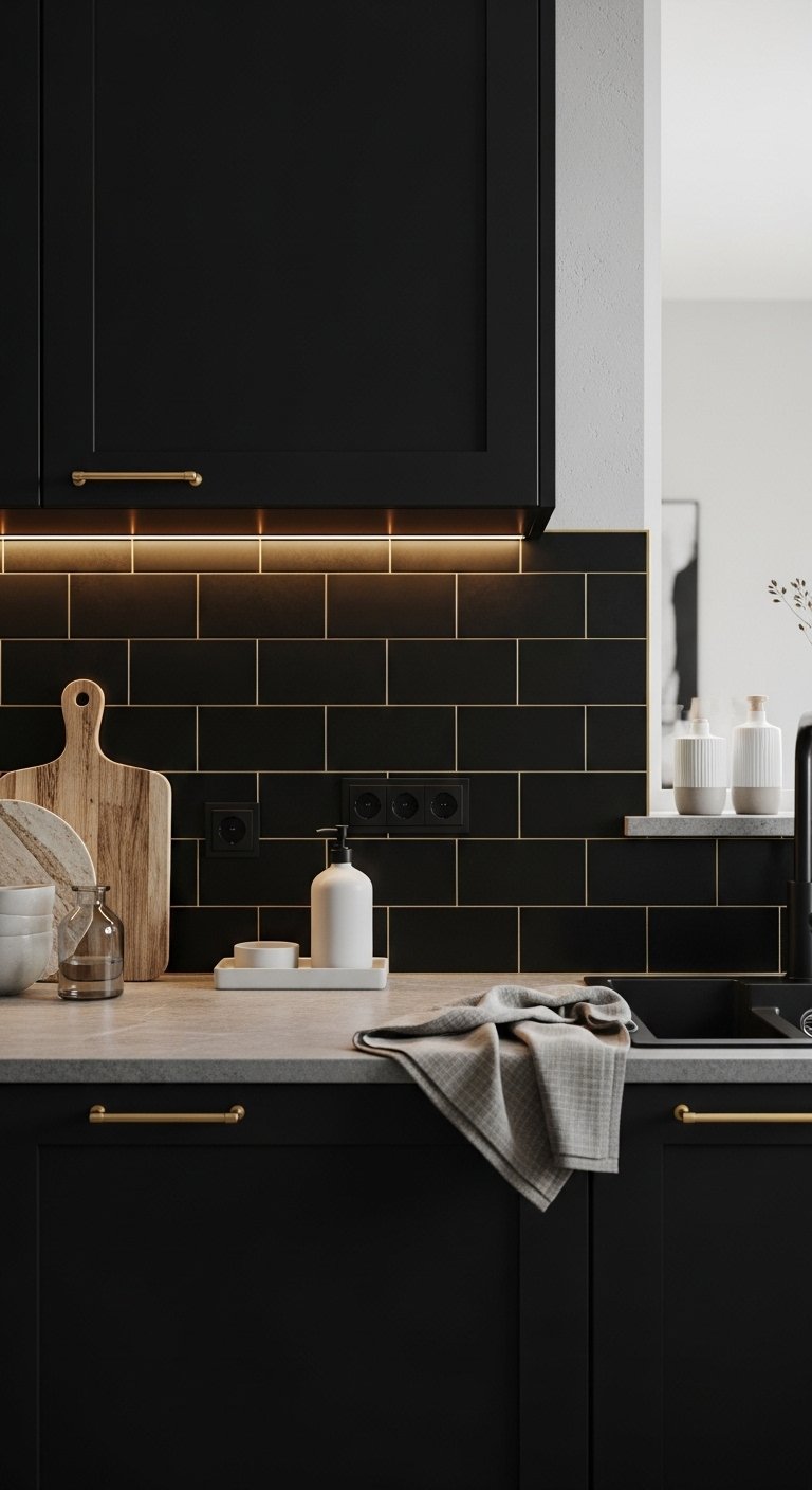 5. Black Tile Backsplash with Gold Grout Lines for Subtle Luxury Detail