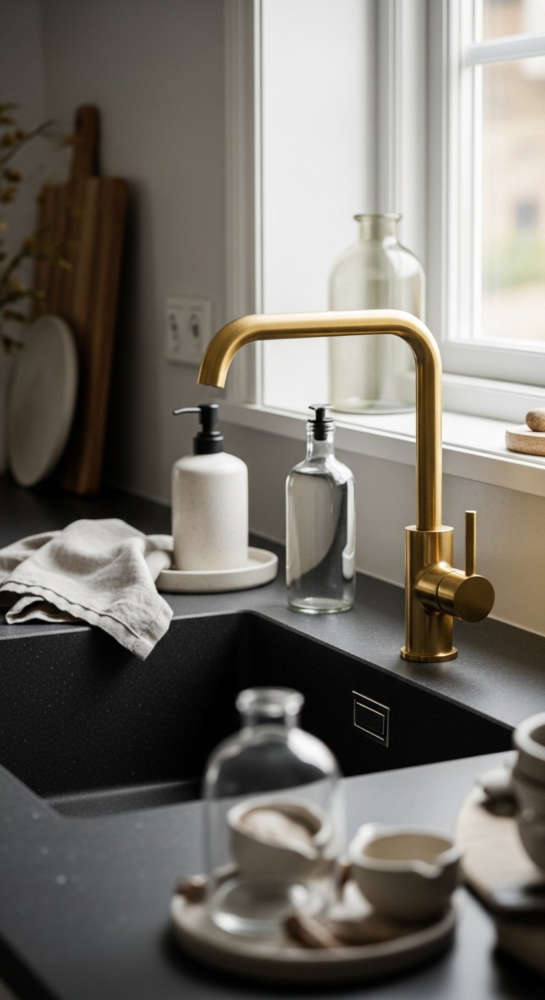 The sink area becomes a luxury highlight when a gold faucet is placed against a black countertop or black stone sink. This combination creates a strong contrast that immediately draws attention. The gold finish stands out beautifully against the dark surface, turning a simple functional area into a design feature.For best results, choose a modern faucet shape such as curved arch or straight minimal design. Avoid overly complex designs so the focus stays on color contrast. Pair this with a clean black backsplash or countertop to keep the area visually strong. Adding soft overhead lighting enhances the reflective gold surface, especially when water flows, creating a subtle shimmering effect. This is one of the easiest ways to introduce luxury into your kitchen without changing the entire layout, making it highly practical and visually impactful.