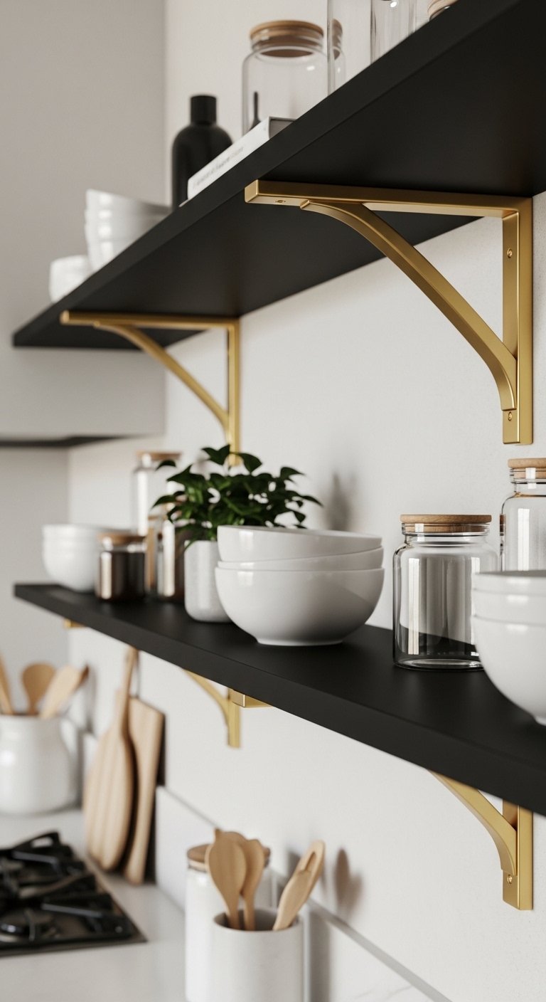 7. Black Open Shelving with Gold Brackets for Elegant Display Style