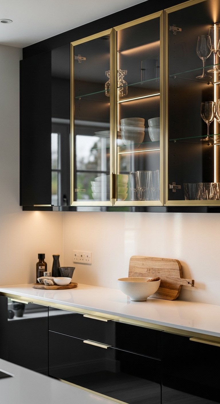 8. Glossy Black Cabinets with Gold Frame Glass Doors for Modern Elegance