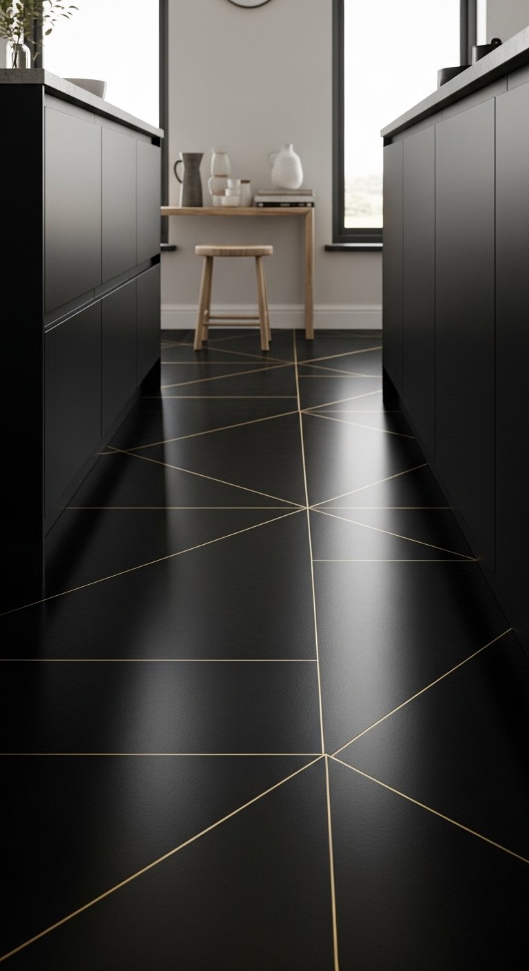 9. Black Flooring with Thin Gold Line Patterns for Hidden Luxury Detail