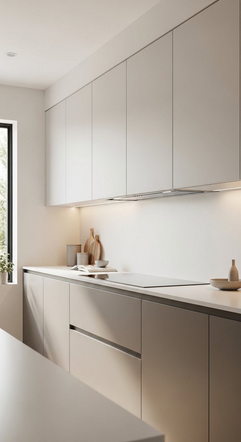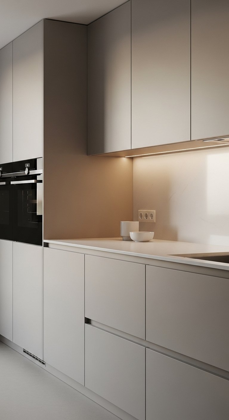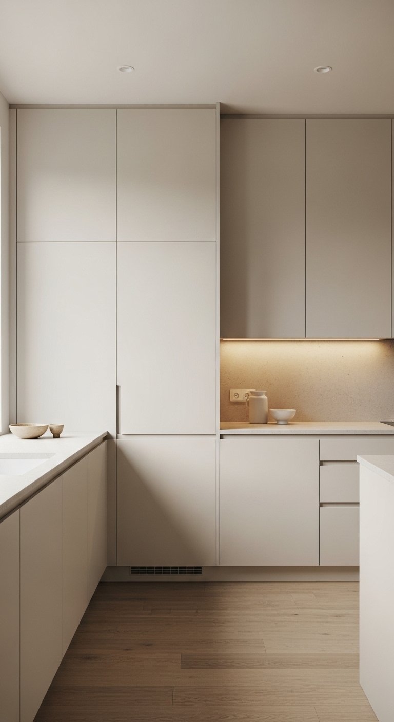 Floor-to-ceiling cabinets create a smooth vertical line that instantly makes your kitchen look taller and more organized. This design removes the awkward empty space above cabinets where dust and clutter usually collect. By extending cabinets all the way up, you create a continuous surface that supports a clean kitchen aesthetic.Choose flat-panel doors in soft neutral tones to maintain a minimal look. Keep the upper sections for items you do not use daily, while lower sections stay functional and easy to access. This layout improves both storage and visual balance.The vertical flow also guides the eye upward, making even a small kitchen feel more open. When combined with hidden handles and soft lighting, this approach creates a calm and structured environment that feels modern, spacious, and thoughtfully designed without adding unnecessary detail.
