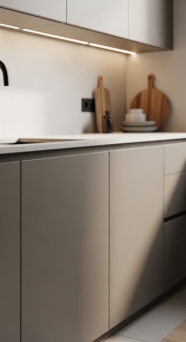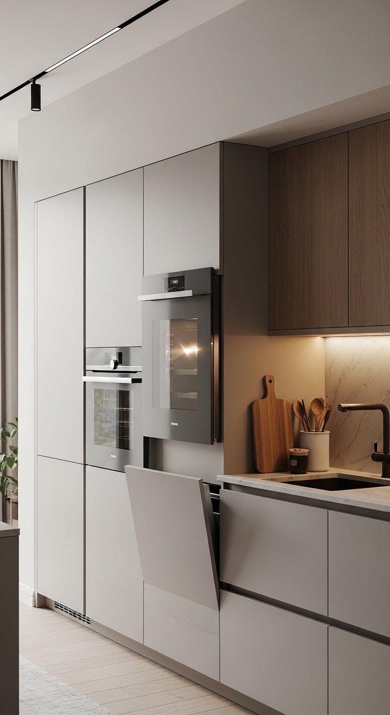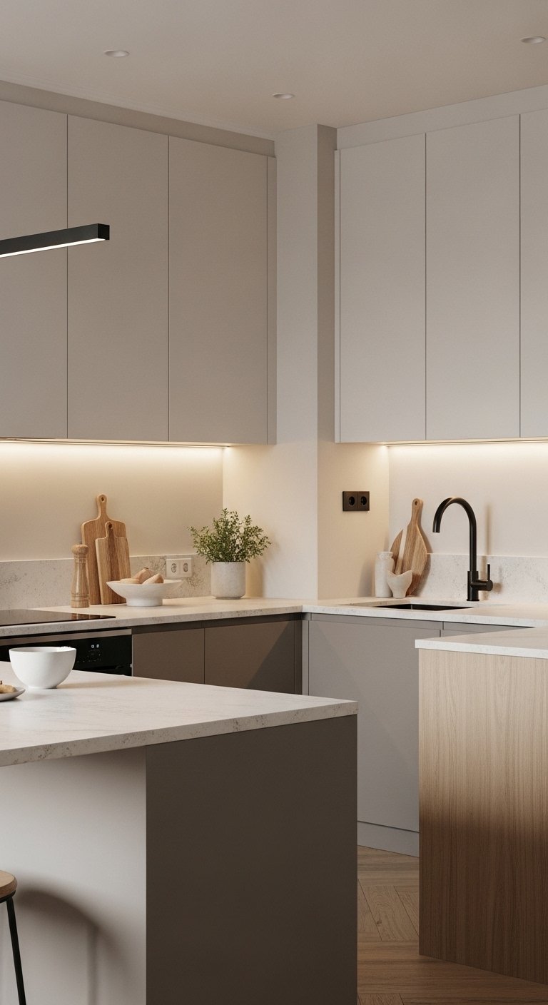 Floor-to-ceiling cabinets create a smooth vertical line that instantly makes your kitchen look taller and more organized. This design removes the awkward empty space above cabinets where dust and clutter usually collect. By extending cabinets all the way up, you create a continuous surface that supports a clean kitchen aesthetic.Choose flat-panel doors in soft neutral tones to maintain a minimal look. Keep the upper sections for items you do not use daily, while lower sections stay functional and easy to access. This layout improves both storage and visual balance.The vertical flow also guides the eye upward, making even a small kitchen feel more open. When combined with hidden handles and soft lighting, this approach creates a calm and structured environment that feels modern, spacious, and thoughtfully designed without adding unnecessary detail.