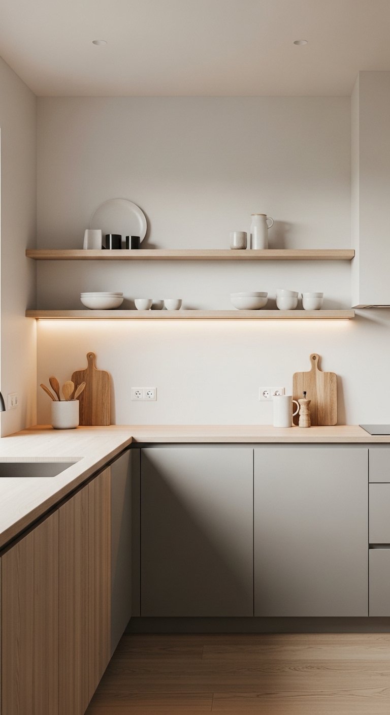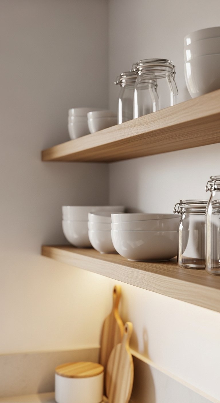 Open shelves can look beautiful, but too many can quickly make a kitchen feel messy. Limit yourself to one or two shelves to maintain a minimal kitchen design while still adding personality. The key is to style them with intention, not decoration overload.Use matching items like white ceramic bowls, clear glass jars, or neutral mugs. Keep spacing even and avoid stacking too many objects together. This creates a clean and breathable look.Choose natural materials like light wood for the shelves to add warmth without heaviness. Place them where they get soft natural light so the items feel highlighted but not overwhelming.By keeping open shelving minimal and organized, you create a balanced space that feels styled yet uncluttered, making your kitchen both functional and visually calm.