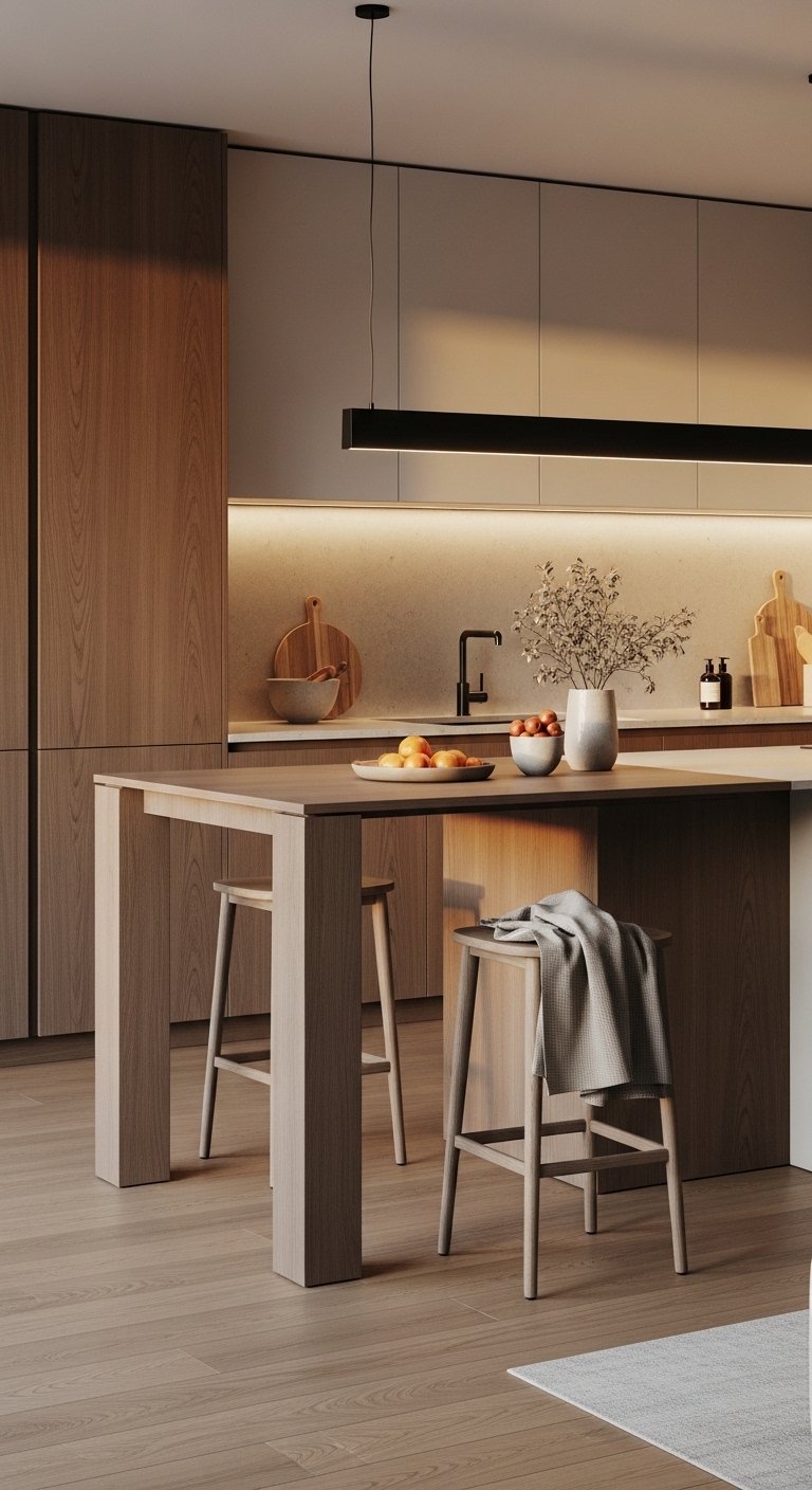 A slim kitchen island can improve both function and style without making the space feel crowded. Choose a simple rectangular shape with clean, straight edges to match a clean kitchen aesthetic.Keep the design minimal by avoiding heavy decorations or bulky features. A light-colored surface or soft wood finish works best for maintaining a calm look. You can also include hidden storage inside the island to keep essentials out of sight.Make sure there is enough walking space around the island so the kitchen still feels open and easy to move in. Add one or two simple stools in neutral tones if needed.This type of island becomes a quiet centerpiece that supports daily use while keeping the overall design smooth, balanced, and visually light without adding unnecessary complexity.