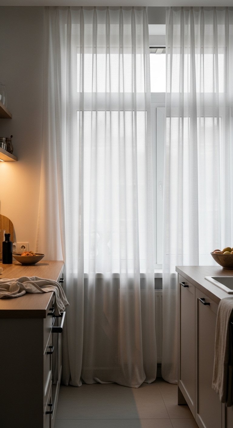 Windows play a big role in how clean and open your kitchen feels. Instead of heavy curtains, choose light, soft fabrics like sheer linen or cotton. These allow natural light to flow in while maintaining privacy.You can also leave windows uncovered if your space allows it. This creates a bright and airy feeling that supports a minimal kitchen design. Natural light enhances soft colors and makes the space feel more alive.Stick to neutral shades like white, cream, or beige for curtains to keep the look simple. Avoid bold patterns or dark colors that can make the space feel heavy.This approach helps your kitchen feel fresh and open throughout the day. The soft light combined with clean surfaces creates a peaceful environment that is both functional and visually calming.