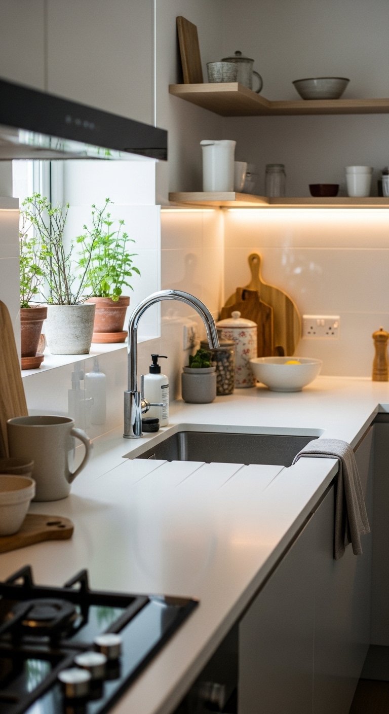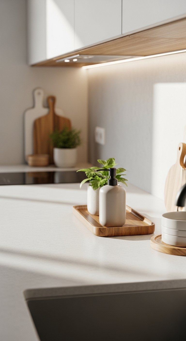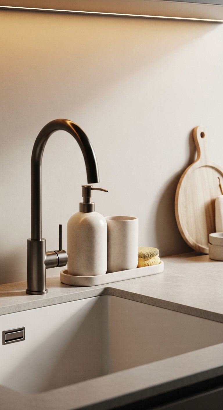 The sink area is often one of the busiest spots in the kitchen, but it can still look clean and organized with a few simple changes. Use a matching soap dispenser, sponge holder, and tray in neutral tones to create a tidy setup.Avoid leaving random items around the sink. Keep only what you need and store the rest out of sight. This reduces clutter and keeps the focus on a clean kitchen aesthetic.Choose materials like ceramic, glass, or brushed metal for a soft and cohesive look. Place items neatly together so they feel intentional rather than scattered.This small styling effort makes a big difference because the sink area is always visible. A clean and organized sink space helps your entire kitchen feel more polished and easy to maintain every day.