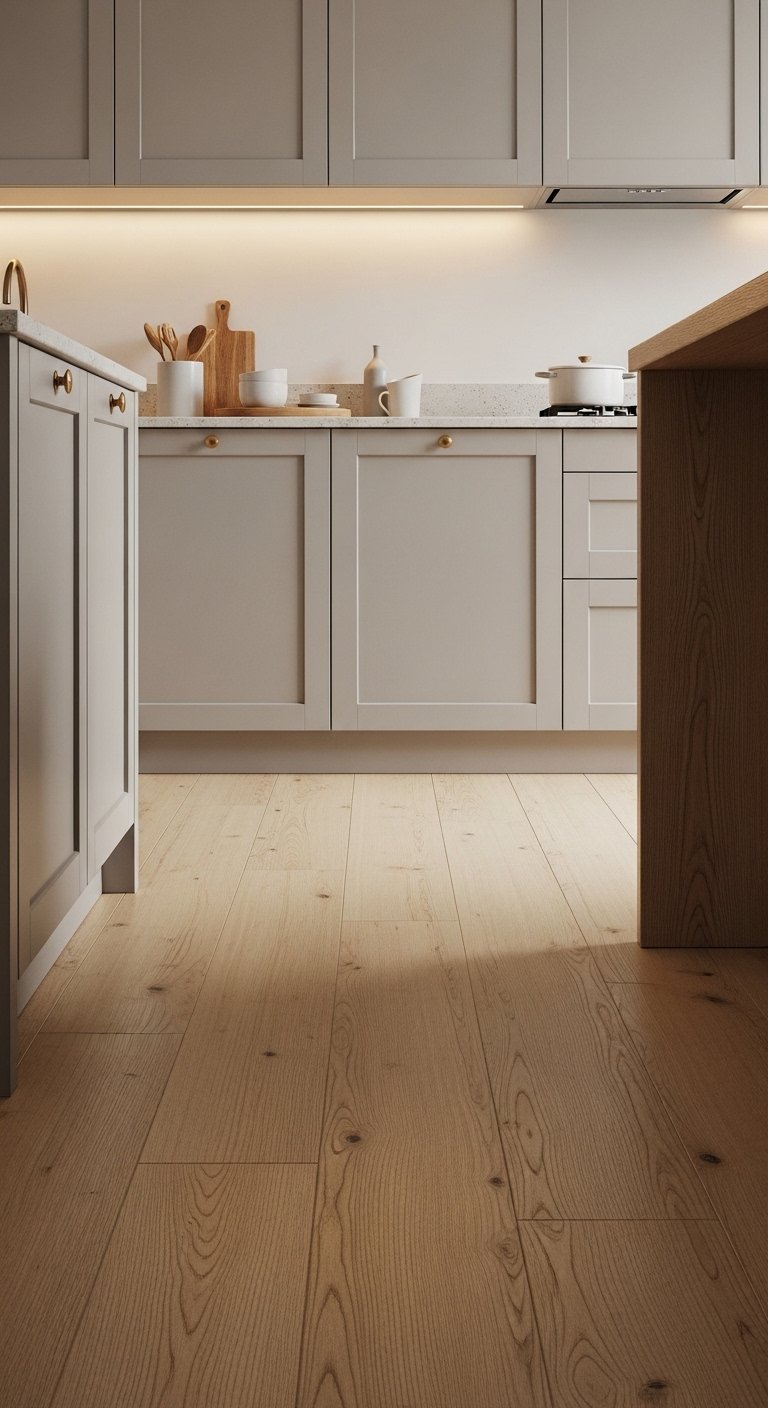 Light wood flooring adds natural warmth while keeping your kitchen bright and minimal. Shades like oak, maple, or ash work well because they reflect light and create a soft base for your design.In a minimal kitchen, flooring should support the overall look without drawing too much attention. Choose simple patterns with clean lines instead of busy textures or dark tones.Pair light wood floors with neutral cabinets and soft lighting to create a balanced and inviting atmosphere. This combination keeps the kitchen from feeling too cold or plain.Light wood also works well with many styles, making it a flexible choice for long-term design. It brings a natural element into the space while maintaining the simplicity and elegance of a clean, modern kitchen.