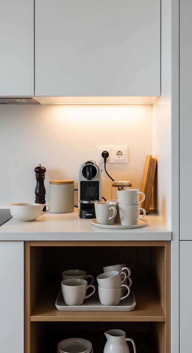 A small, organized coffee or tea nook can keep your kitchen clean while still being functional. Choose a specific corner or cabinet space for your coffee machine, cups, and essentials.Keep the setup simple with a neutral tray, a few matching mugs, and minimal accessories. This prevents items from spreading across the kitchen and maintains a clean kitchen aesthetic.You can also hide this nook behind cabinet doors if you prefer a fully minimal look. This way, everything is accessible but not always visible.By creating a dedicated space, you reduce clutter in other areas and make your routine more efficient. This idea keeps your kitchen organized while adding a small, thoughtful feature that feels both practical and visually pleasing.