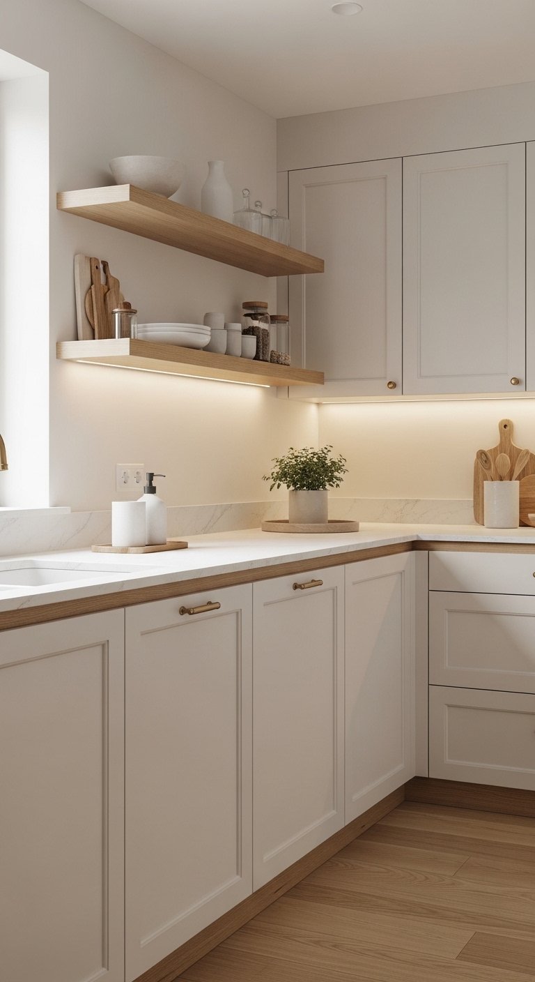 A soft white base is the foundation of a clean kitchen aesthetic because it creates a bright and open feeling without looking cold. Choose whites with warm undertones instead of sharp, cool whites so your space feels inviting and comfortable. Apply this tone across walls, cabinets, and even backsplashes to create a smooth and connected look. This reduces visual breaks and helps the kitchen feel larger. Pair this base with light wood textures like oak or birch to add natural warmth. Matte finishes work better than glossy surfaces because they soften the light and hide small marks. Add warm lighting around 2700K to enhance the cozy feel while keeping the space bright. This combination creates a calm environment where every element blends gently, making your kitchen feel clean, balanced, and easy to enjoy every day without overwhelming your senses.