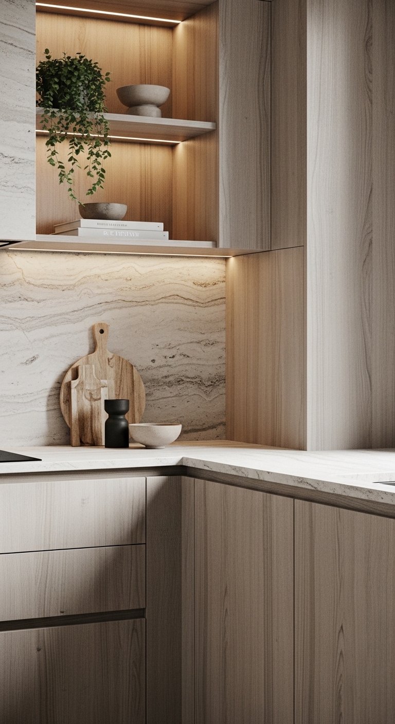 Instead of using strong patterns, bring interest into your kitchen through subtle textures. This keeps the design clean while still adding depth and character.Choose materials like lightly veined stone, soft wood grain, or textured tiles in neutral shades. These details are gentle and do not overwhelm the space. In a minimal kitchen design, texture should feel soft and natural rather than bold or busy.You can apply texture to backsplashes, cabinets, or even small decor items. Keep everything within a controlled color palette so the look remains cohesive.This approach creates a layered and visually interesting kitchen without adding clutter. Subtle textures allow your space to feel warm, modern, and balanced while maintaining the simplicity that defines a clean kitchen aesthetic.