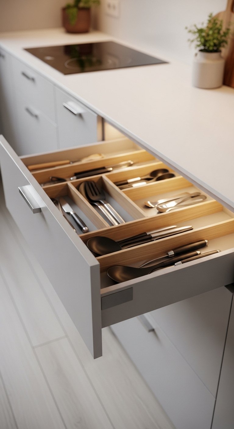 Built-in drawer organizers help your kitchen stay clean without showing any effort on the outside. Instead of stacking items randomly, divide your drawers into neat sections for utensils, tools, and small essentials. This keeps everything in place and easy to find.Choose organizers in natural wood or neutral tones so even inside the drawers, the look stays calm and consistent with a clean kitchen aesthetic. Deep drawers can hold plates and bowls in a vertical arrangement, which saves space and looks more structured.This system removes the need for extra containers on countertops because everything already has a proper place. When you open a drawer, it feels just as organized as the outside looks. This hidden order supports a minimal lifestyle by reducing stress and saving time during daily tasks in a simple and efficient way.