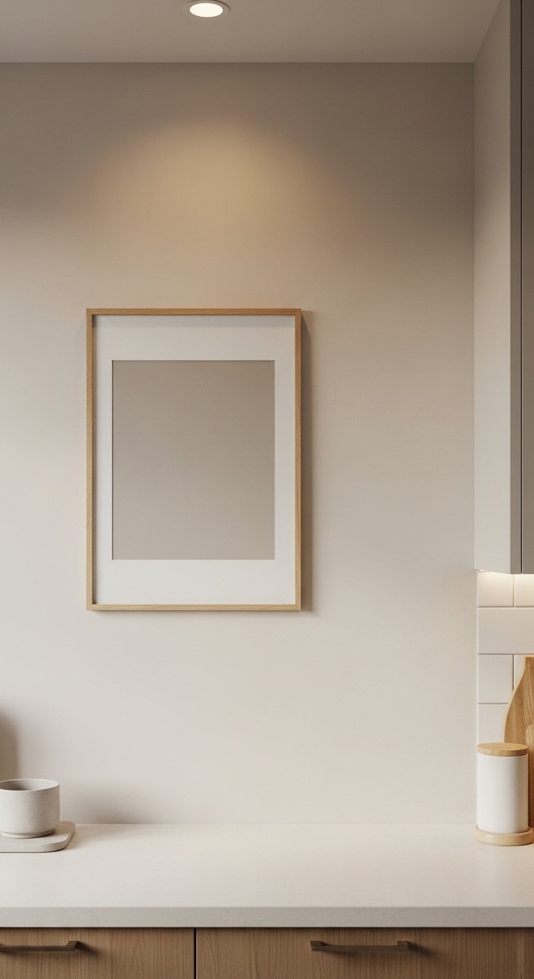 Wall decor in a minimal kitchen should feel quiet and purposeful, not decorative for the sake of filling space. Choose one or two simple pieces, such as a small framed print, a neutral art piece, or a soft textured panel.Stick to calm colors like beige, white, or muted gray to maintain a minimal kitchen design. Avoid bright colors or busy patterns that can break the clean flow of the space. Position your decor where it complements the layout, such as above a coffee nook or near a dining corner.Leave enough empty wall space around the piece so it stands out gently without overwhelming the room. This balance creates a peaceful visual effect. By keeping wall decor minimal, your kitchen feels more open, thoughtful, and aligned with a clean aesthetic that values simplicity over excess.