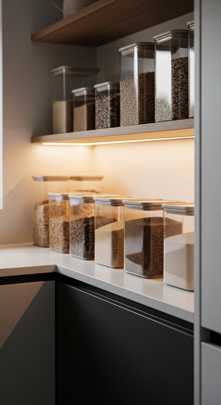 Matching storage containers instantly make your pantry and shelves look clean and organized. Transfer dry foods like rice, pasta, and snacks into uniform jars or containers in glass or matte plastic.Choose simple shapes and neutral lids so everything looks consistent. This removes the visual clutter of different packaging and supports a clean kitchen aesthetic. Transparent containers also make it easy to see what you have, reducing waste and saving time.Arrange the containers in straight lines with equal spacing to create a structured look. You can label them in a subtle and simple style if needed.This small change transforms your storage into a visually pleasing system that feels calm and functional. It turns everyday items into part of your kitchen design while keeping everything neat and easy to manage.