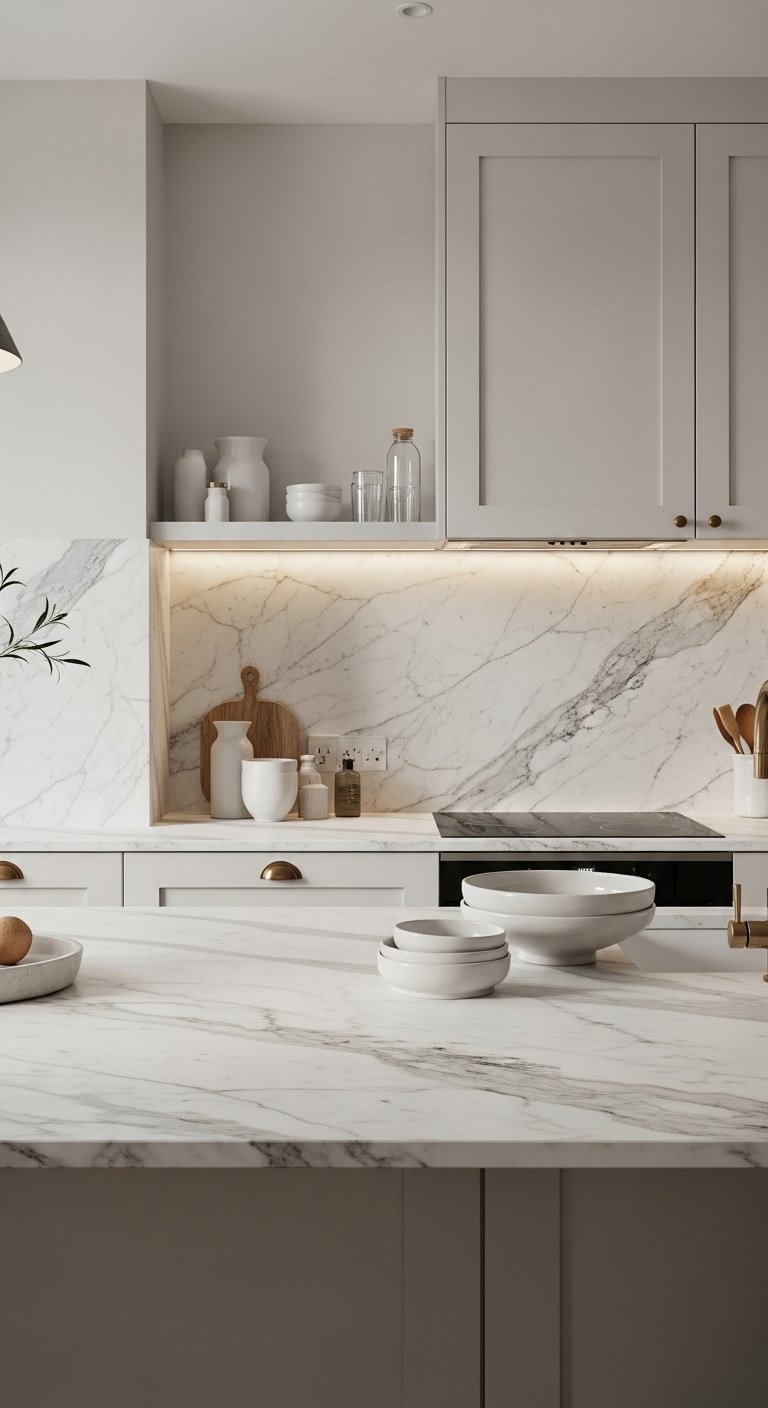 Using one statement material throughout your kitchen creates a strong and clean visual flow that feels simple but very intentional. Instead of mixing many textures, select one material like light marble, soft concrete, or pale wood and repeat it in key areas such as countertops, backsplash, or open shelving. This repetition reduces visual noise and helps the entire kitchen feel connected. For example, a light marble surface used on both the counter and backsplash creates a seamless look that feels elegant and minimal at the same time. Keep other elements neutral so the material stands out gently without overpowering the space. The goal is not to make the kitchen busy but to create harmony through consistency. This method is perfect for a clean kitchen aesthetic because it allows the eye to move smoothly across the space, making everything feel calm, balanced, and thoughtfully designed.