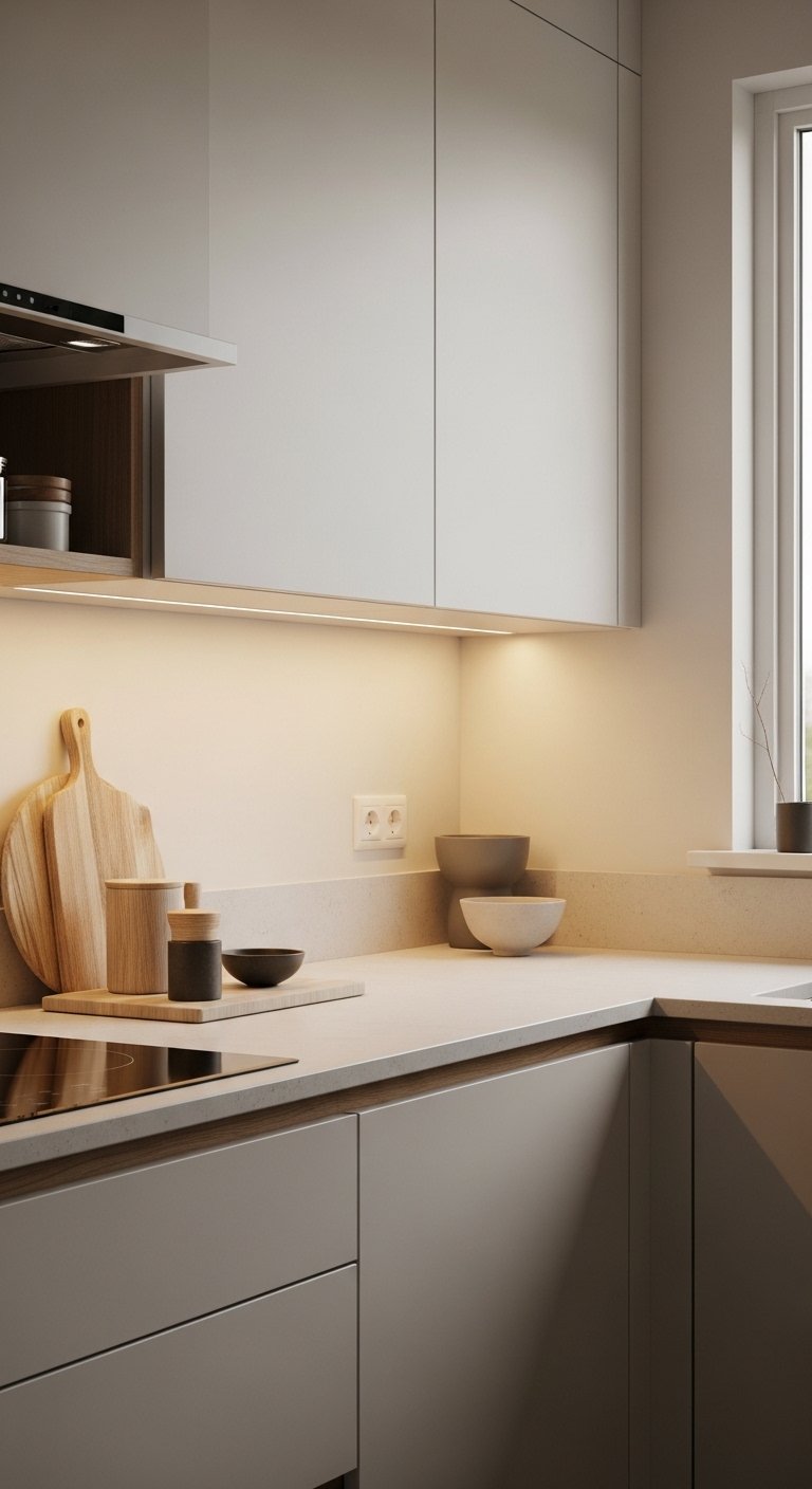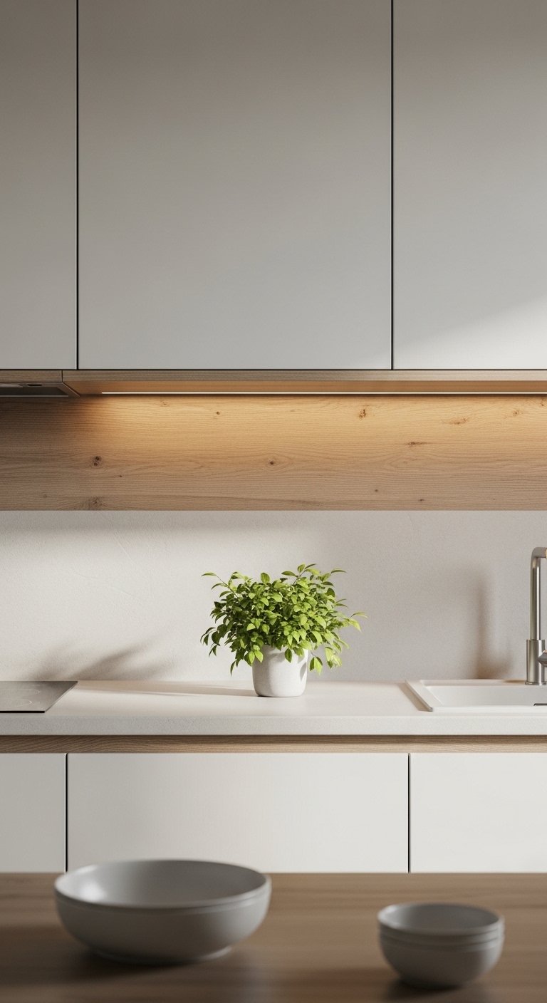 Soft under-cabinet lighting adds depth and warmth while keeping your kitchen looking clean and modern. Install LED strip lights beneath your upper cabinets to create a gentle glow across the countertop surface. This lighting should feel soft and even, not harsh or overly bright, so it enhances the space without drawing too much attention. Warm white tones between 2700K and 3000K work best because they create a cozy and welcoming atmosphere. This type of lighting highlights textures like stone or tile without making the kitchen feel busy. It also improves functionality by giving you focused light for cooking and preparing food without needing strong overhead lights. In a clean kitchen aesthetic, lighting should support the design quietly. This simple upgrade transforms your kitchen into a calm, layered space that feels stylish, comfortable, and easy to use at any time of the day.