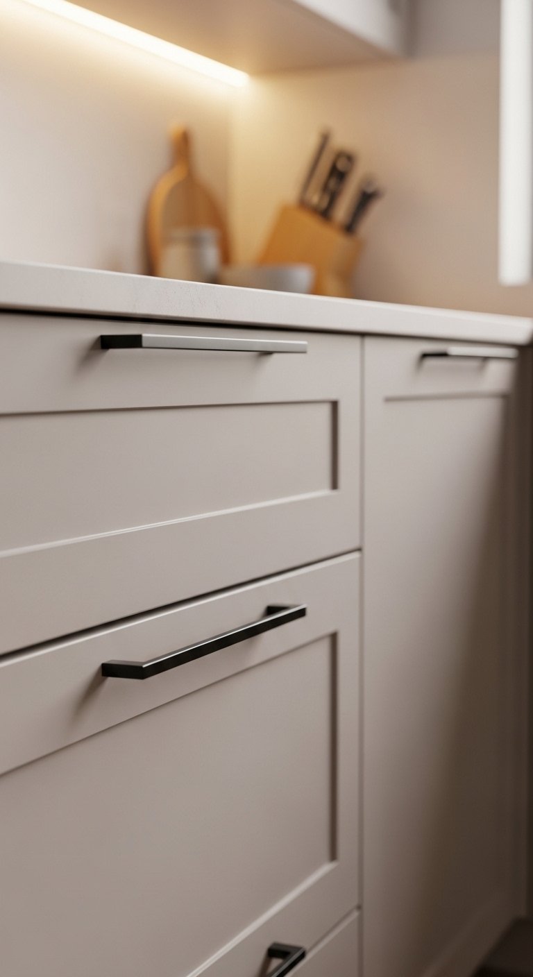 Hardware may seem like a small detail, but it plays a big role in keeping your kitchen design clean and minimal. Choose slim, simple handles that do not stand out too much. Thin bar handles in brushed metal or matte black create a modern look without adding visual weight. You can also match your handles with your faucet or lighting fixtures to keep everything consistent. Another great option is integrated edge pulls that are built into the cabinet design, making them almost invisible. Avoid decorative or bulky hardware because it can break the smooth flow of your kitchen. In a minimal kitchen design, simplicity always works better than complexity. These small choices help maintain a seamless appearance across all surfaces. When hardware blends naturally with the design, your kitchen feels more polished, organized, and visually calm without any unnecessary distractions.