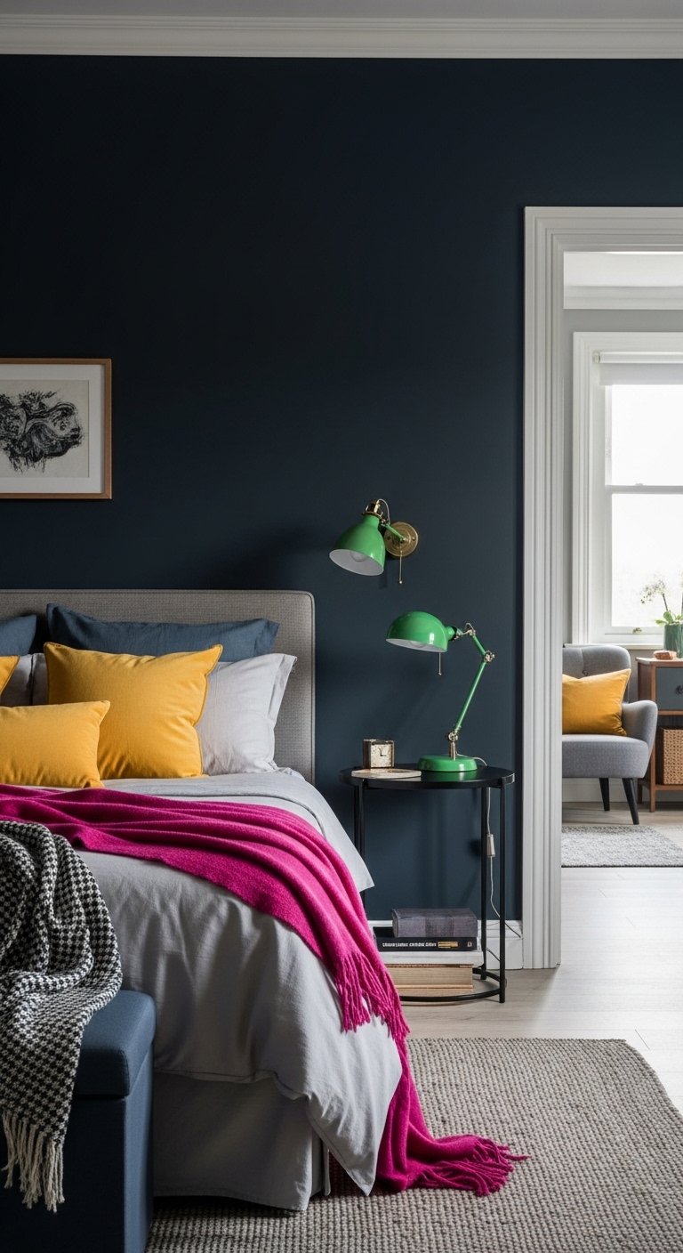 Create a moody yet vibrant atmosphere by painting walls in deep shades like charcoal, navy, or forest green, then adding bright accents such as mustard pillows, fuchsia throws, or emerald lamps. Dark walls make colors pop, adding depth and intimacy while keeping the space stylish. Incorporate reflective elements like mirrors or metallic décor to prevent the room from feeling heavy. Layer soft textures such as velvet cushions, wool rugs, or silk bedding to balance the drama with comfort. This combination produces a sophisticated, adult-friendly bedroom that feels both bold and cozy. It’s a Pinterest-ready strategy for those who love statement-making rooms without compromising elegance.