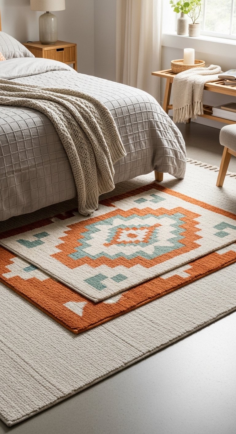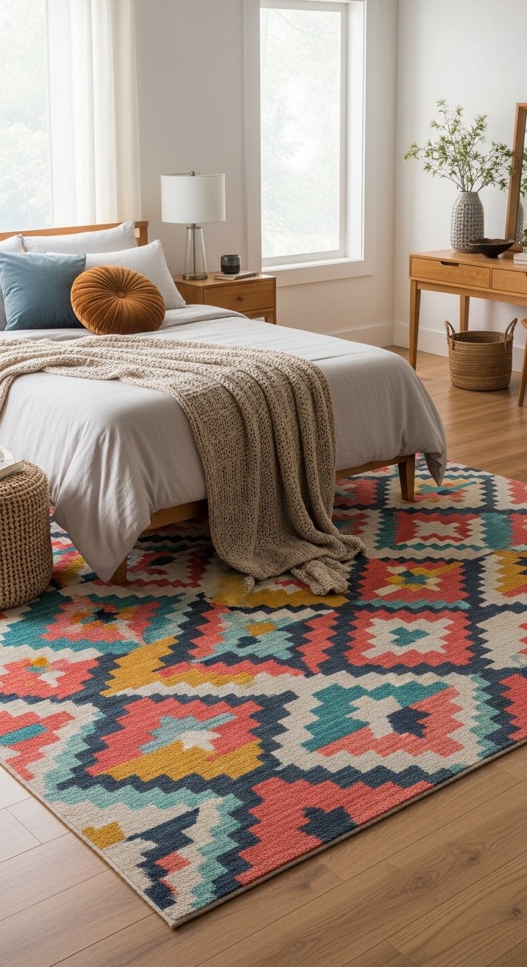 Introduce a bold, patterned rug to anchor your bedroom and infuse it with color. Choose geometric prints, abstract designs, or hand-woven patterns that combine two or three accent colors from your palette. Layering a smaller neutral rug underneath can add depth, texture, and visual intrigue. A vibrant rug not only provides warmth and comfort underfoot but also defines functional zones such as a reading nook or seating area. Pair it with simple furniture and bedding in neutral tones to ensure the rug remains the focal point. Rugs allow for seasonal or style updates without major renovation and are Pinterest-ready elements that bring energy, sophistication, and tactile richness. This approach demonstrates that a single design element, thoughtfully chosen, can transform an adult bedroom from ordinary to stylish and lively.