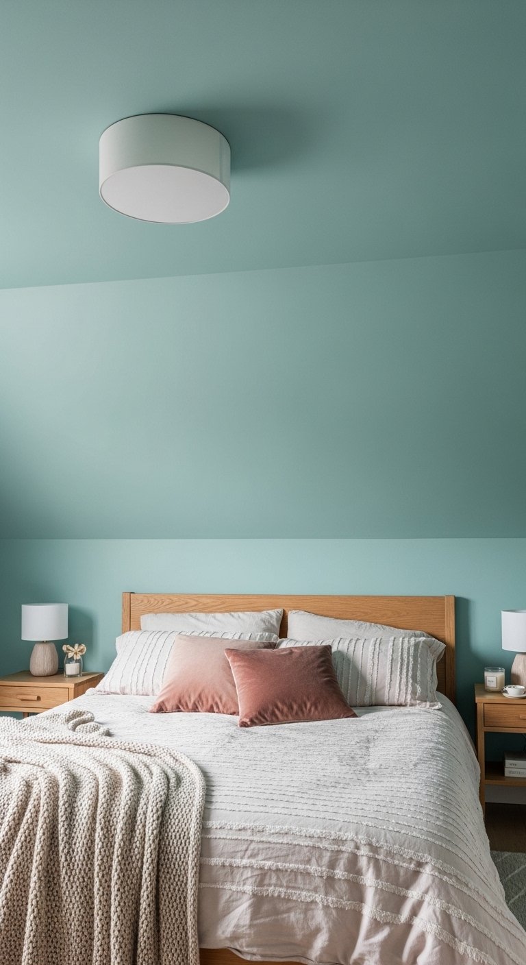 Give your bedroom a unique twist by painting the ceiling a bold or unexpected color, such as deep teal, blush pink, or golden ochre. This technique draws the eye upward, creating an illusion of height while adding personality in a subtle, sophisticated way. Pair the colored ceiling with neutral walls to prevent the room from feeling heavy, and incorporate small accents that echo the ceiling hue—like throw pillows, lampshades, or art frames—for a cohesive look. Soft lighting enhances the ceiling’s impact, especially with pendant lights or indirect LED strips. A painted ceiling turns an often-overlooked surface into a design statement, making the bedroom feel curated and stylish. This approach is perfect for adults seeking a bold, Pinterest-worthy bedroom that feels original, playful, and luxurious without overwhelming the senses.