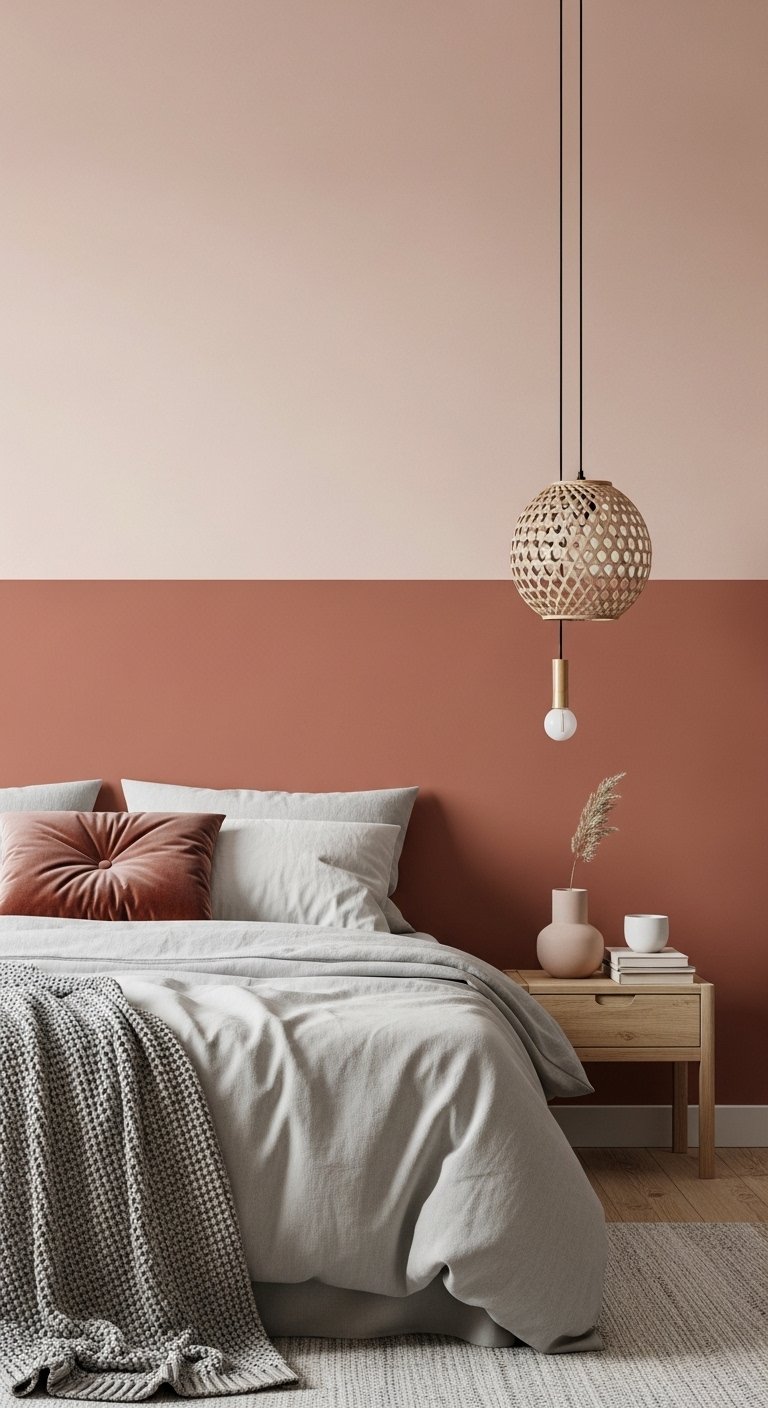 Create a stylish and modern bedroom by dividing walls into two complementary colors. For instance, a soft blush on the upper half with a muted terracotta below adds warmth while visually grounding the space. The dividing line can be crisp and horizontal or subtly angled for an artistic effect. Use neutral furniture and soft textiles to maintain balance and prevent the room from feeling busy. Layer textures through bedding, curtains, and rugs to add depth. This method allows you to experiment with bold color choices without dominating the entire room, offering flexibility for seasonal updates. Two-tone walls provide a clean yet dynamic visual impact, perfect for a Pinterest-ready adult bedroom that feels contemporary, sophisticated, and creatively designed.