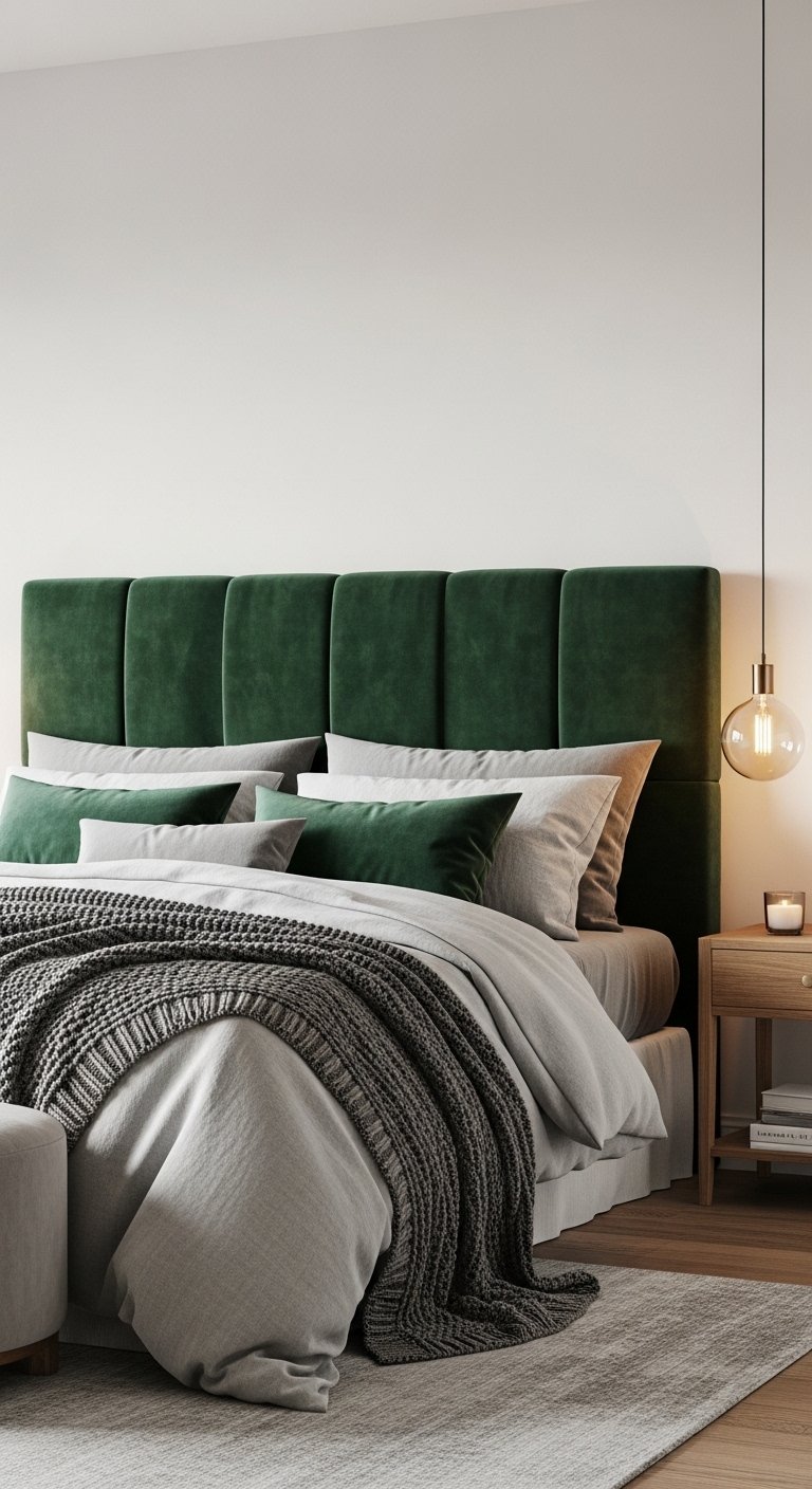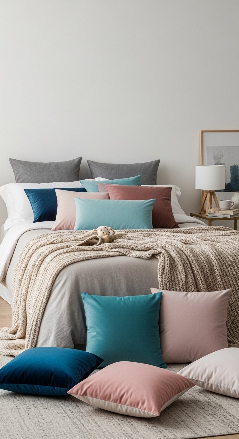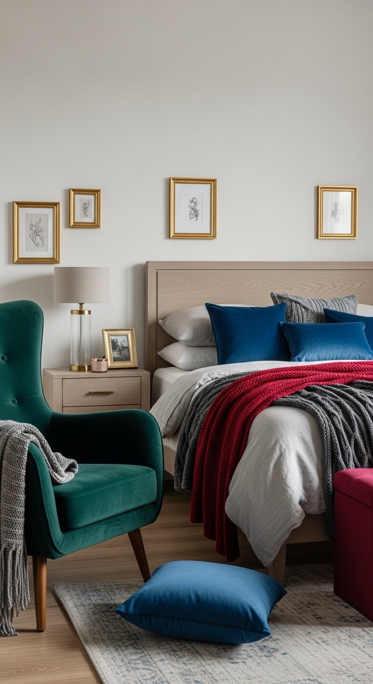 Introduce rich jewel tones through velvet pillows, an accent chair, or a small upholstered bench to instantly elevate your bedroom. Colors like emerald green, sapphire blue, or deep ruby create a sophisticated yet inviting atmosphere that feels expensive without being overwhelming. Velvet’s soft, reflective texture adds dimension, catching natural or ambient light to make the colors glow. Balance these bold accents with neutral walls and bedding—creams, soft grays, or muted taupe—to prevent the space from feeling heavy. To make the look cohesive, add small metallic touches such as brushed gold bedside lamps or picture frames. Layering velvet cushions of varying sizes and patterns, alongside a textured rug or knitted throw, introduces tactile contrast. This approach transforms simple furnishings into a stylish, Pinterest-ready setup that is both visually striking and perfectly adult-friendly, showing how thoughtful pops of color can add warmth and personality.
