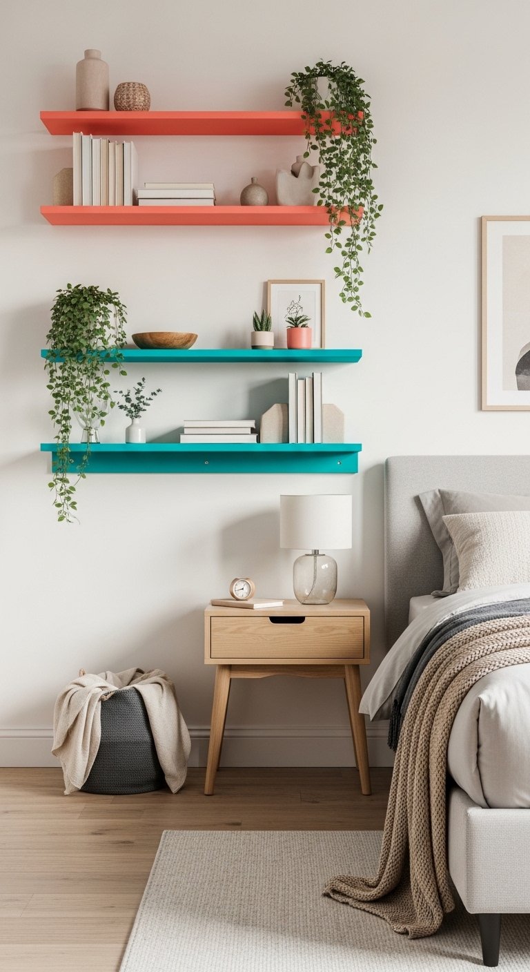 Floating shelves painted in vibrant hues, like coral, teal, or chartreuse, can serve as both storage and decorative elements. Display books, plants, or small artwork on these shelves to showcase personality while keeping the room organized. Coordinating the shelf colors with accent pieces like cushions or wall art ensures a cohesive, curated look. Floating shelves add dimension and break up large wall spaces, giving your bedroom a layered and visually engaging appearance. They’re perfect for adults who want practical storage without sacrificing style. By thoughtfully arranging items and mixing textures—ceramic, glass, and fabric—you create a Pinterest-ready space that’s lively, functional, and aesthetically balanced, demonstrating that color can be both purposeful and playful.