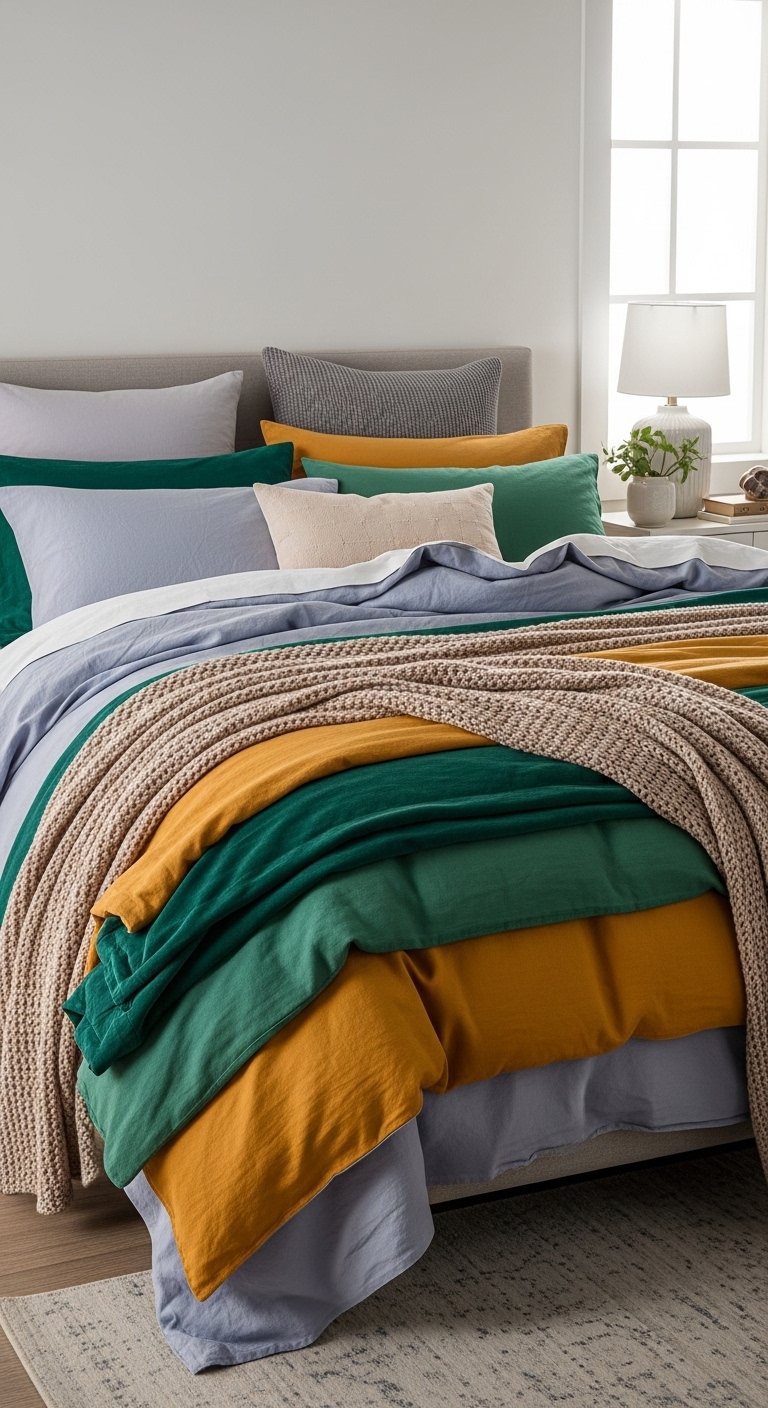 Create depth and personality by layering bedding in complementary colors and textures. Combine sheets, duvet covers, and blankets in shades like blush, emerald, or soft mustard, and mix materials like cotton, linen, and velvet. Add patterned or textured pillows to enhance visual interest. Layering allows you to introduce multiple colors without overwhelming the room, creating a soft, inviting, and dynamic look. Keep walls and furniture neutral to highlight the bedding as the main color anchor. This approach not only looks Pinterest-ready but is practical, allowing easy swaps or seasonal updates. Layered bedding brings warmth, comfort, and sophistication, giving your adult bedroom a curated, designer-inspired feel with a playful yet cohesive use of color.